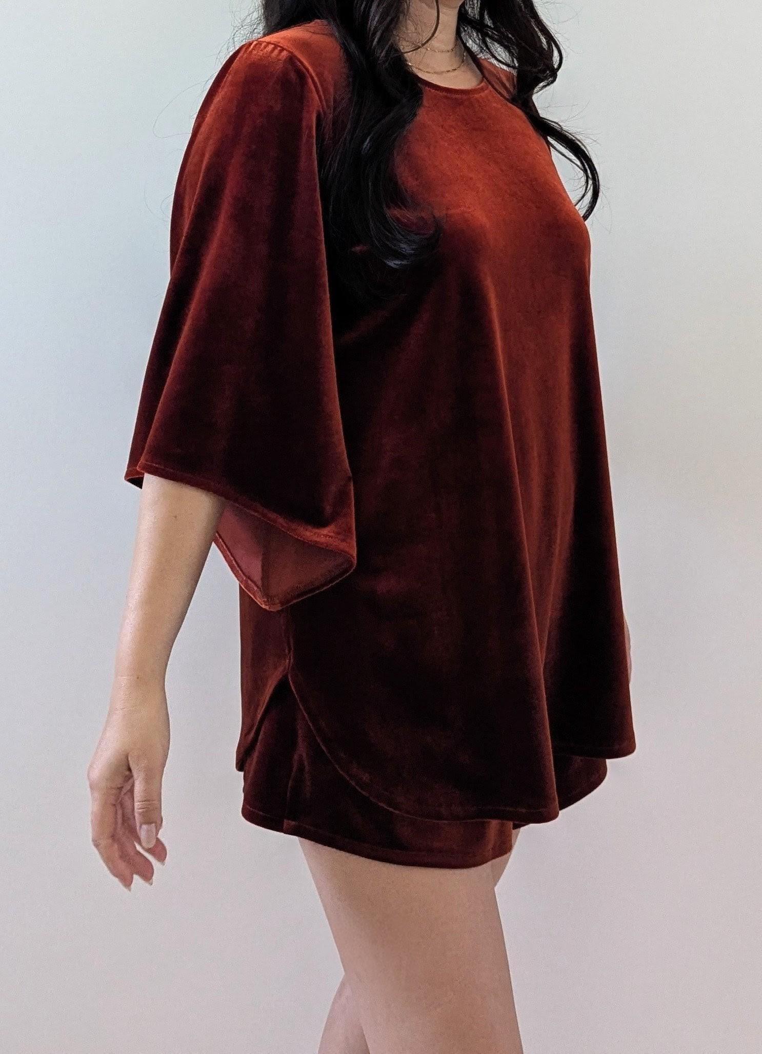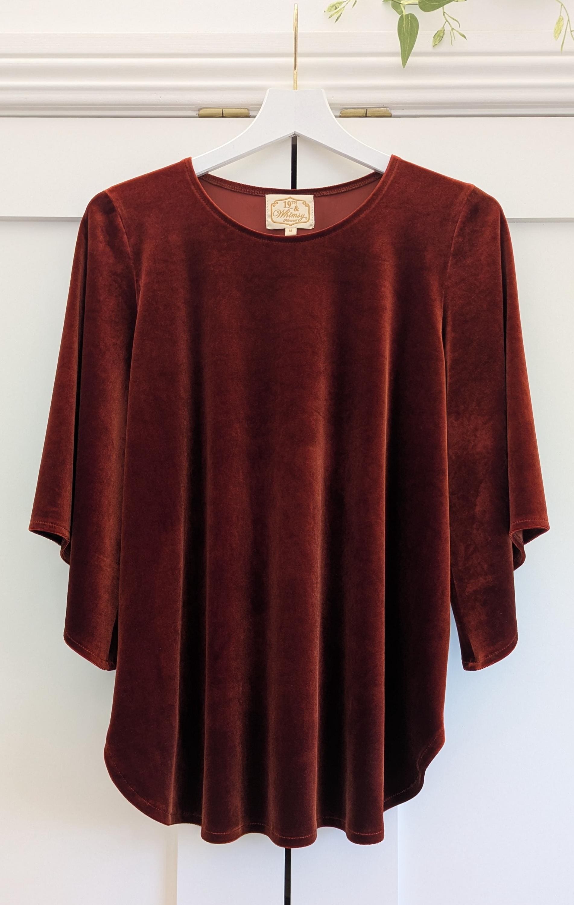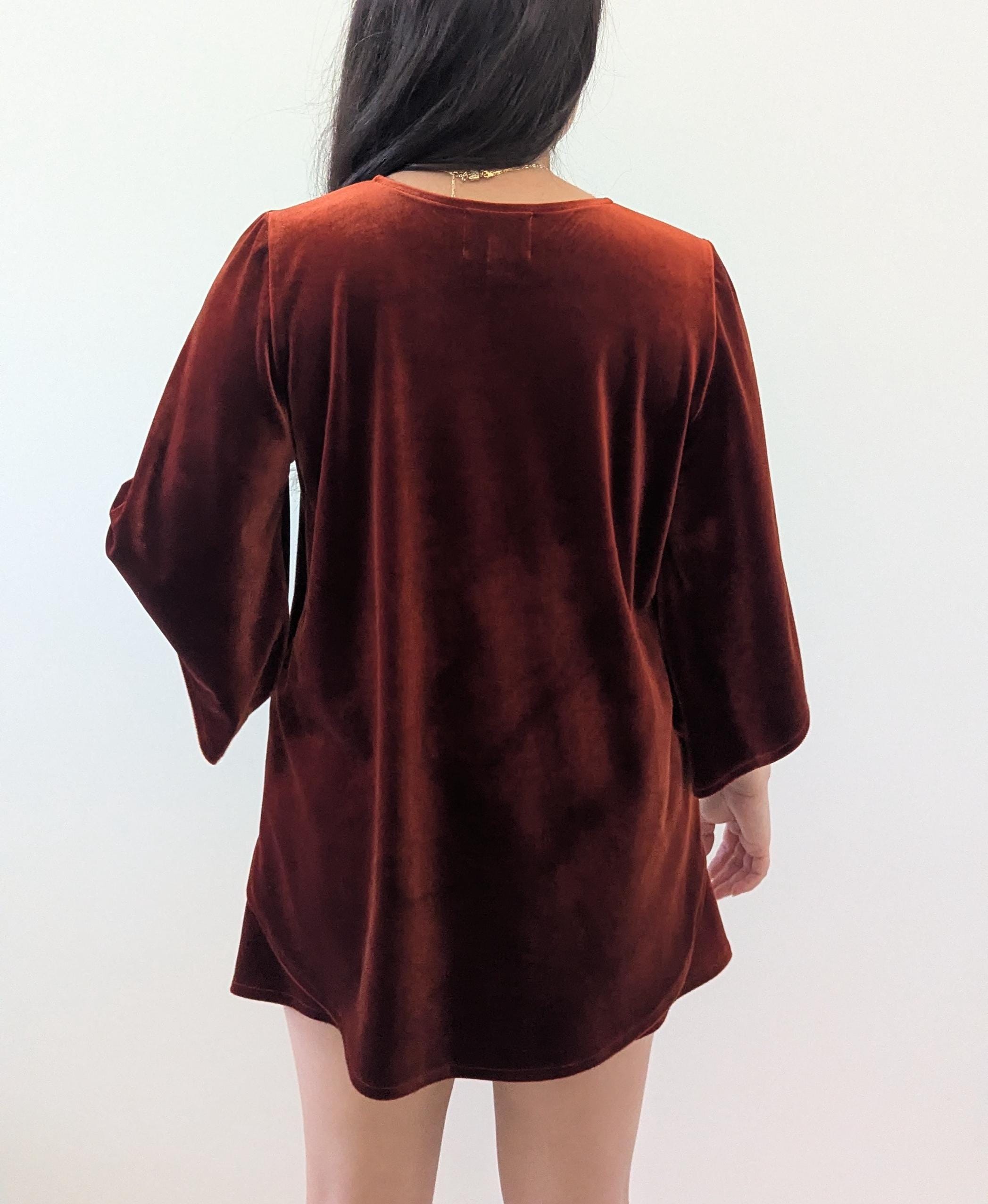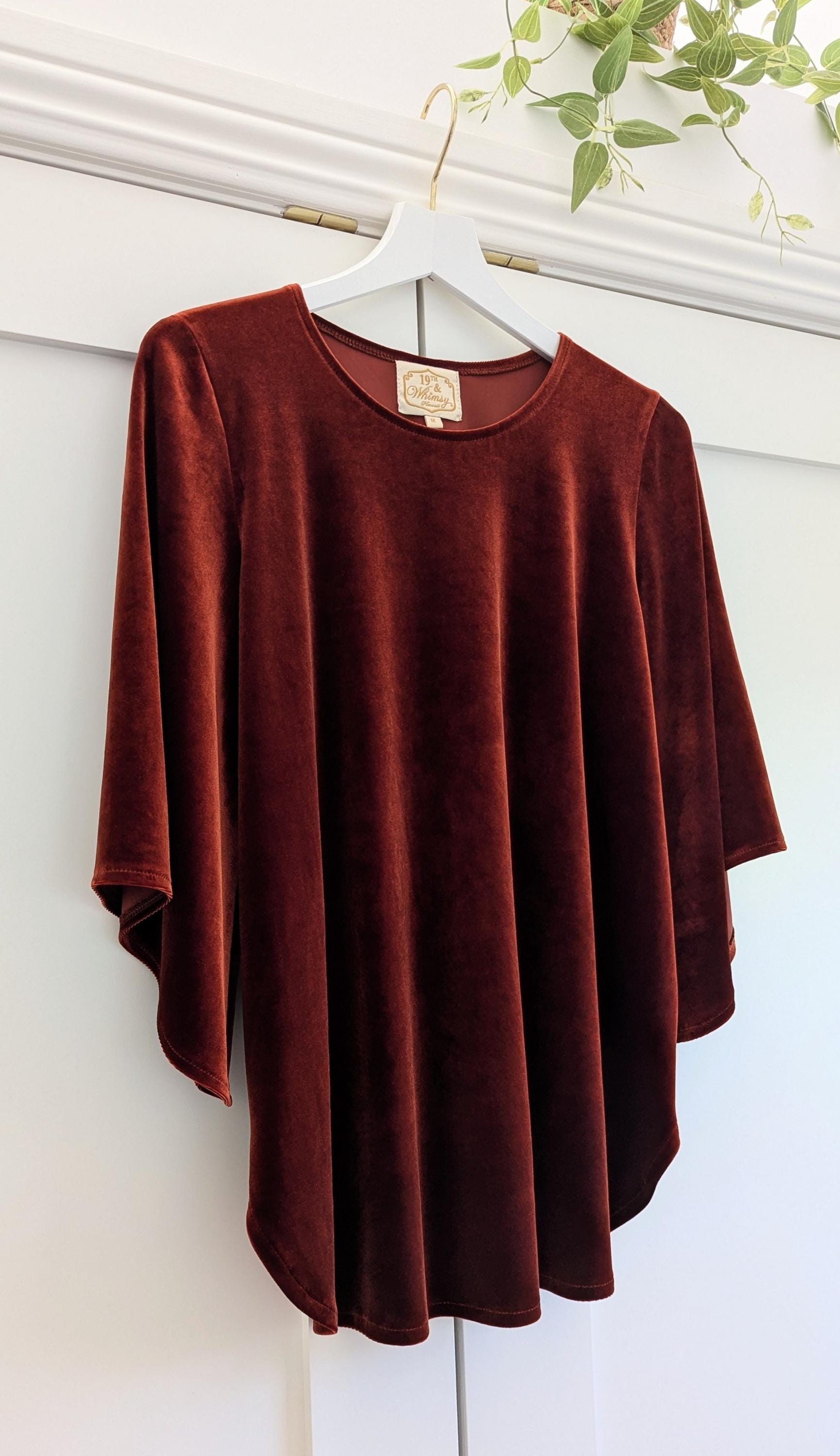 The Velvet Flutter Tunic Top looks great over leggings or shorts. Please note that the Rust Orange, Toffee, Blue Steel, & Jet Black fabrics are slightly heavier-weight than the Pink Mauve, Plum Purple, & Olive Green. Velvets appear dramatically different depending on lighting. Please request a swatch for $1 if you're unsure about a color.
