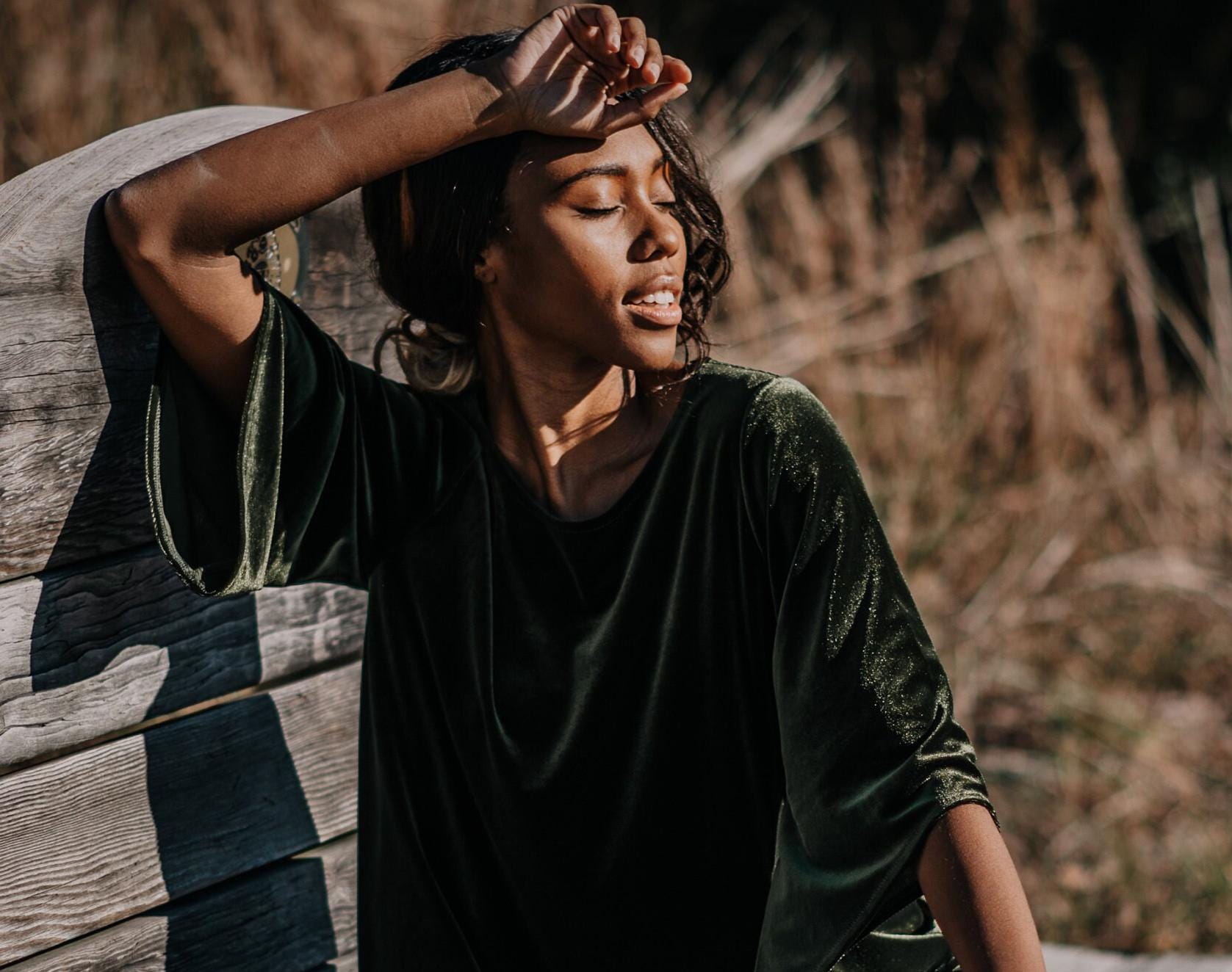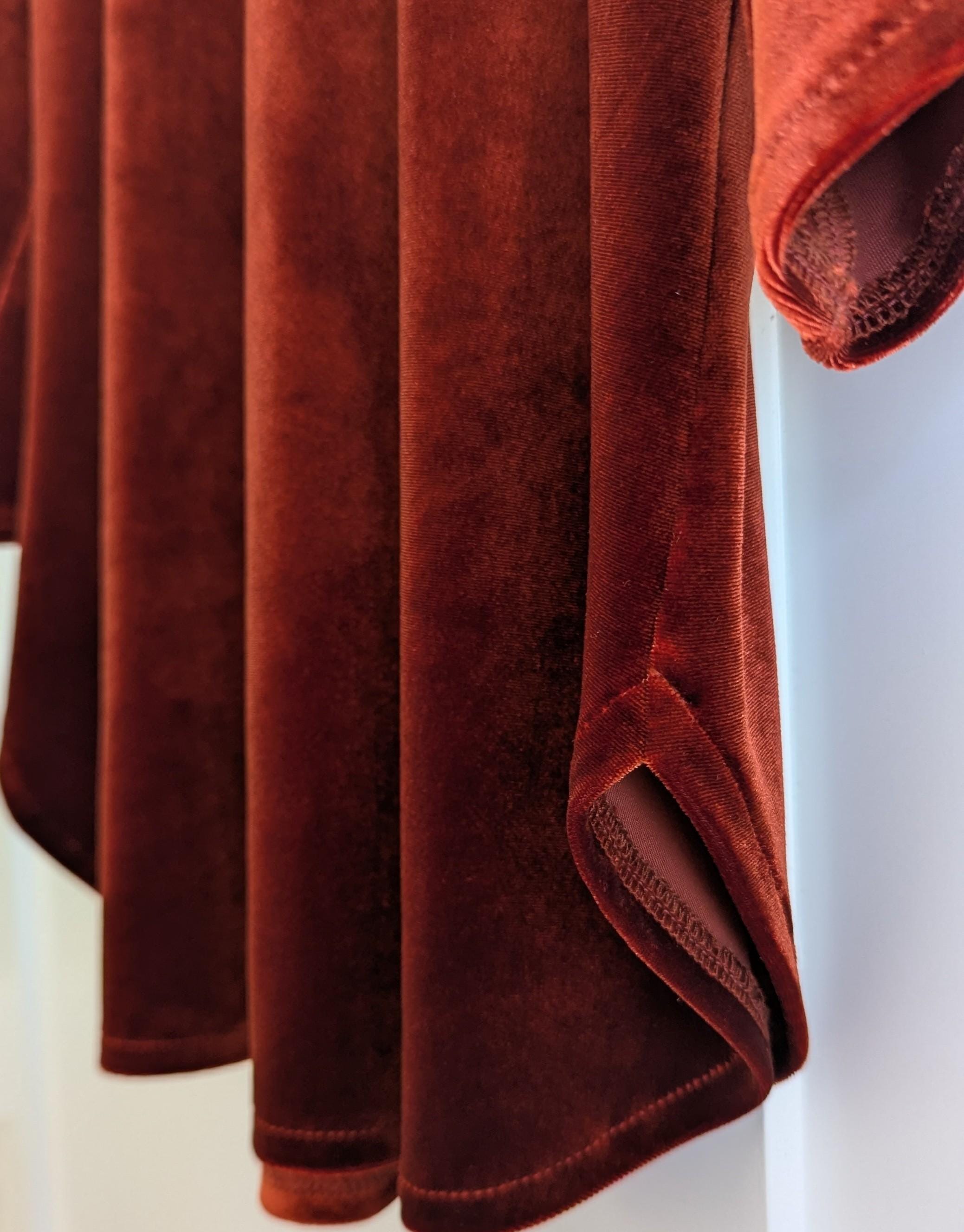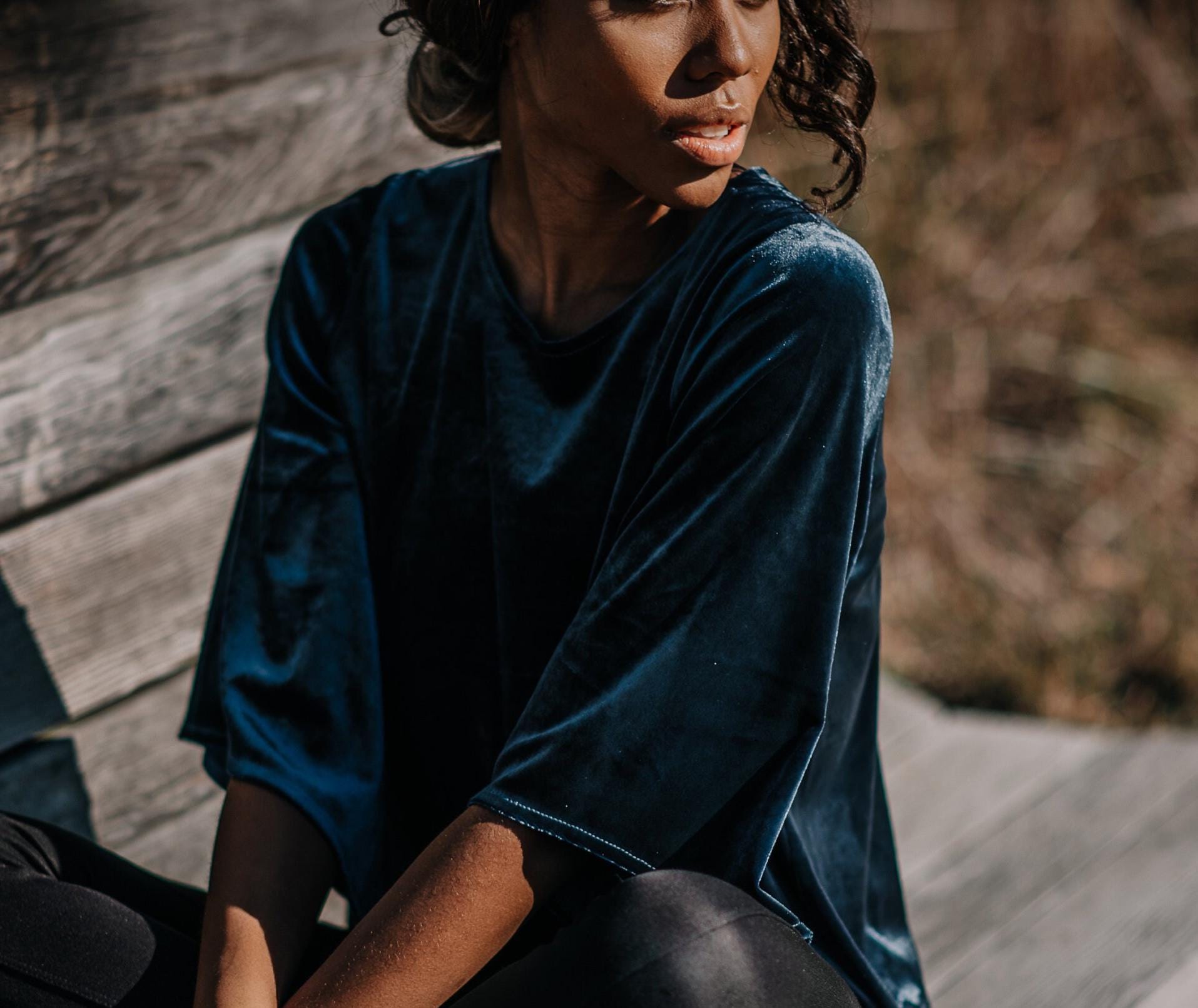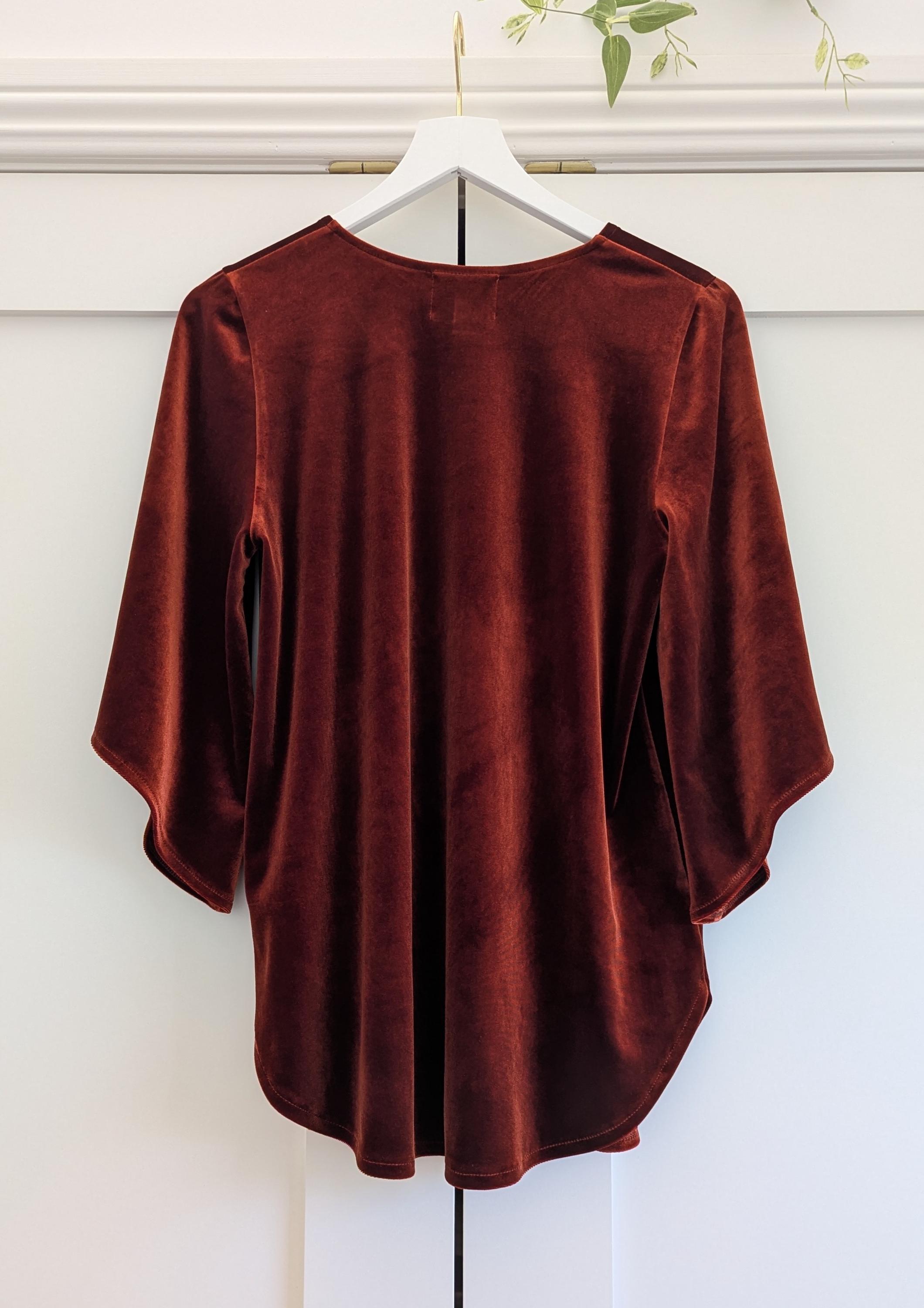 The Velvet Flutter Tunic Top looks great over leggings or shorts. Please note that the Rust Orange, Toffee, Blue Steel, & Jet Black fabrics are slightly heavier-weight than the Pink Mauve, Plum Purple, & Olive Green. Velvets appear dramatically different depending on lighting. Please request a swatch for $1 if you're unsure about a color.