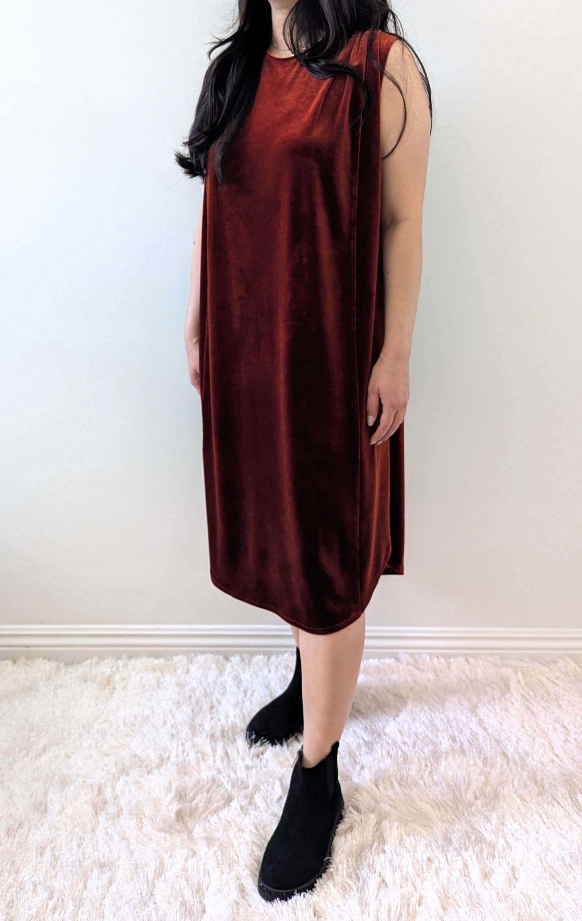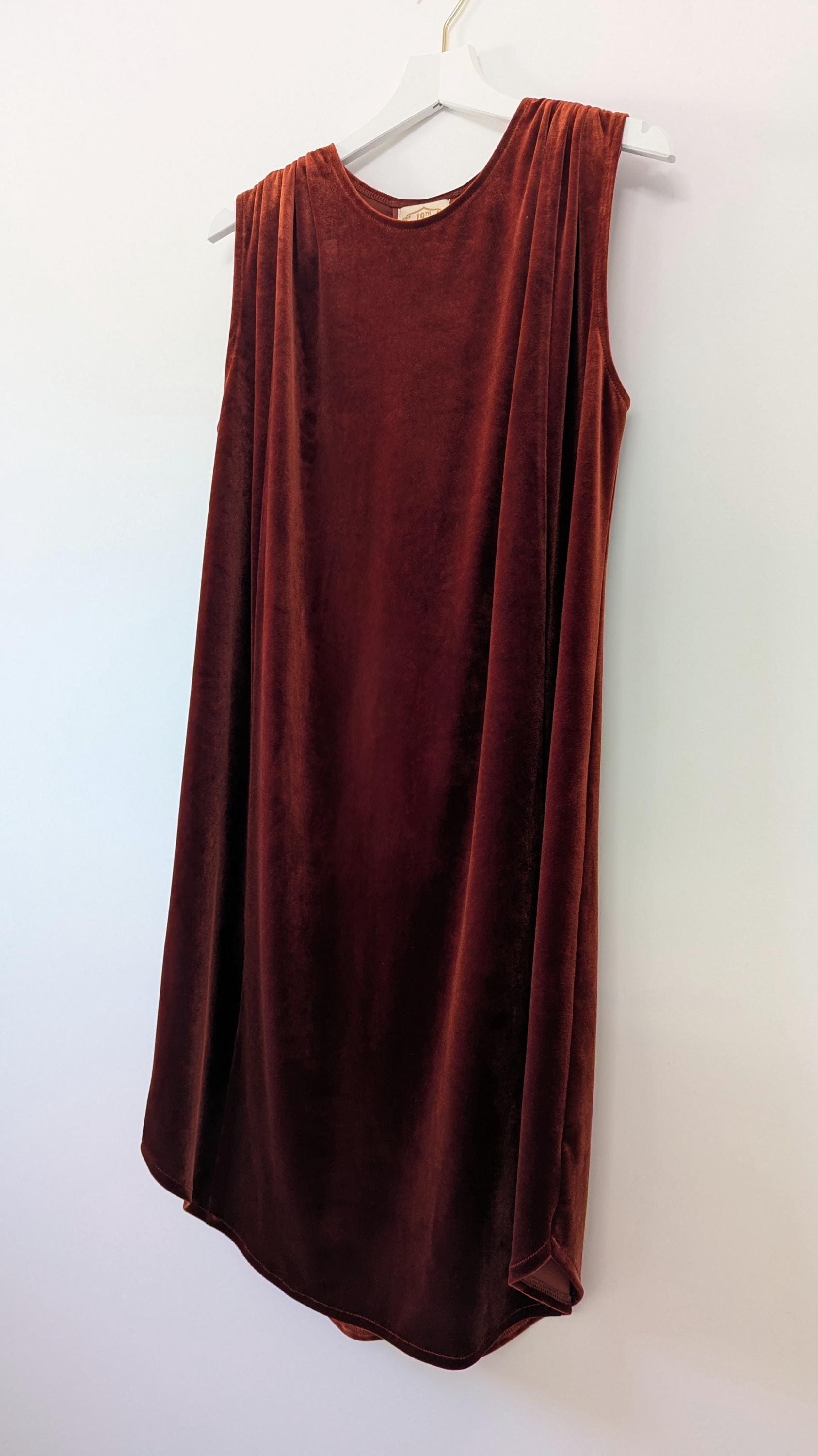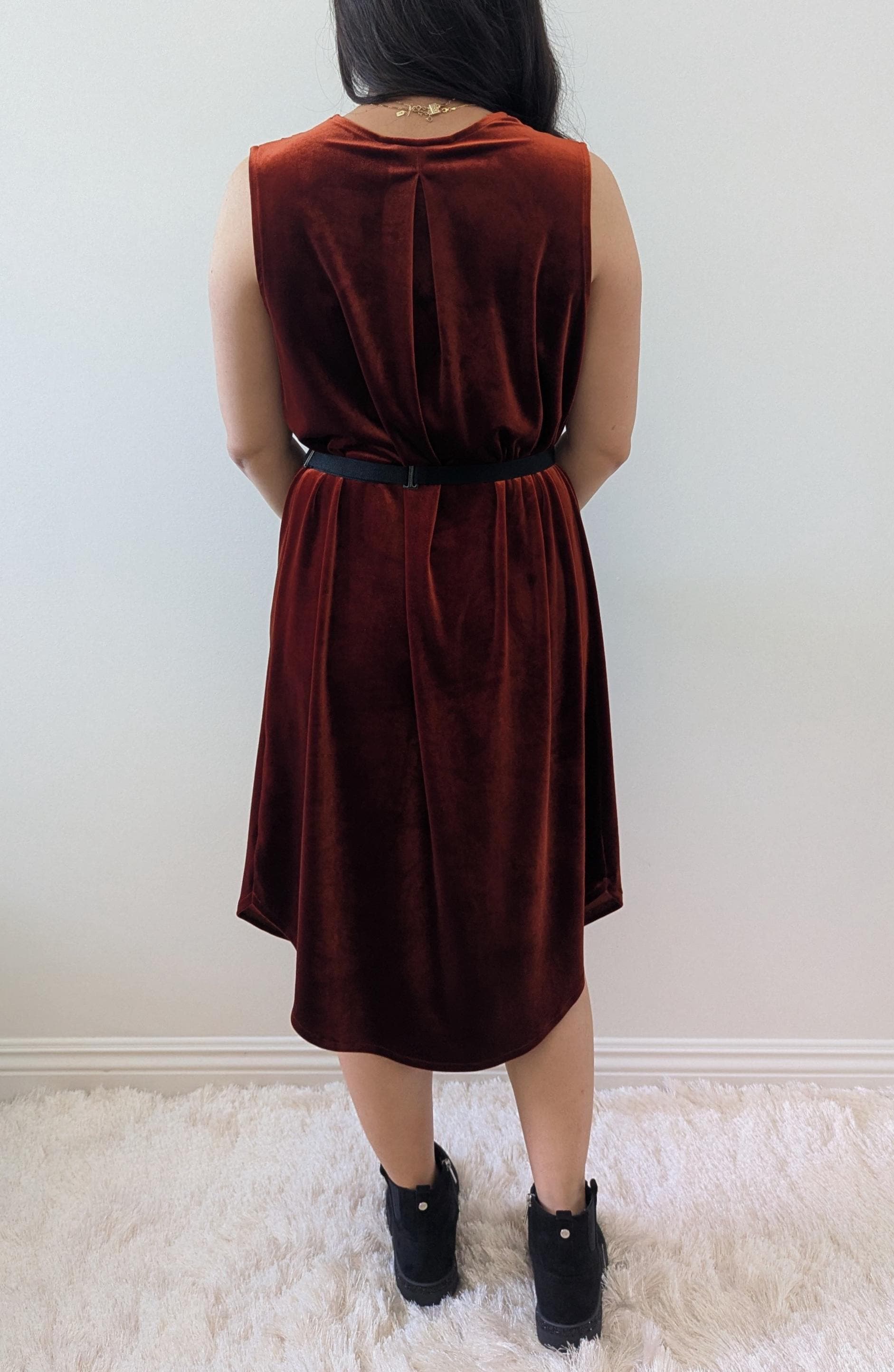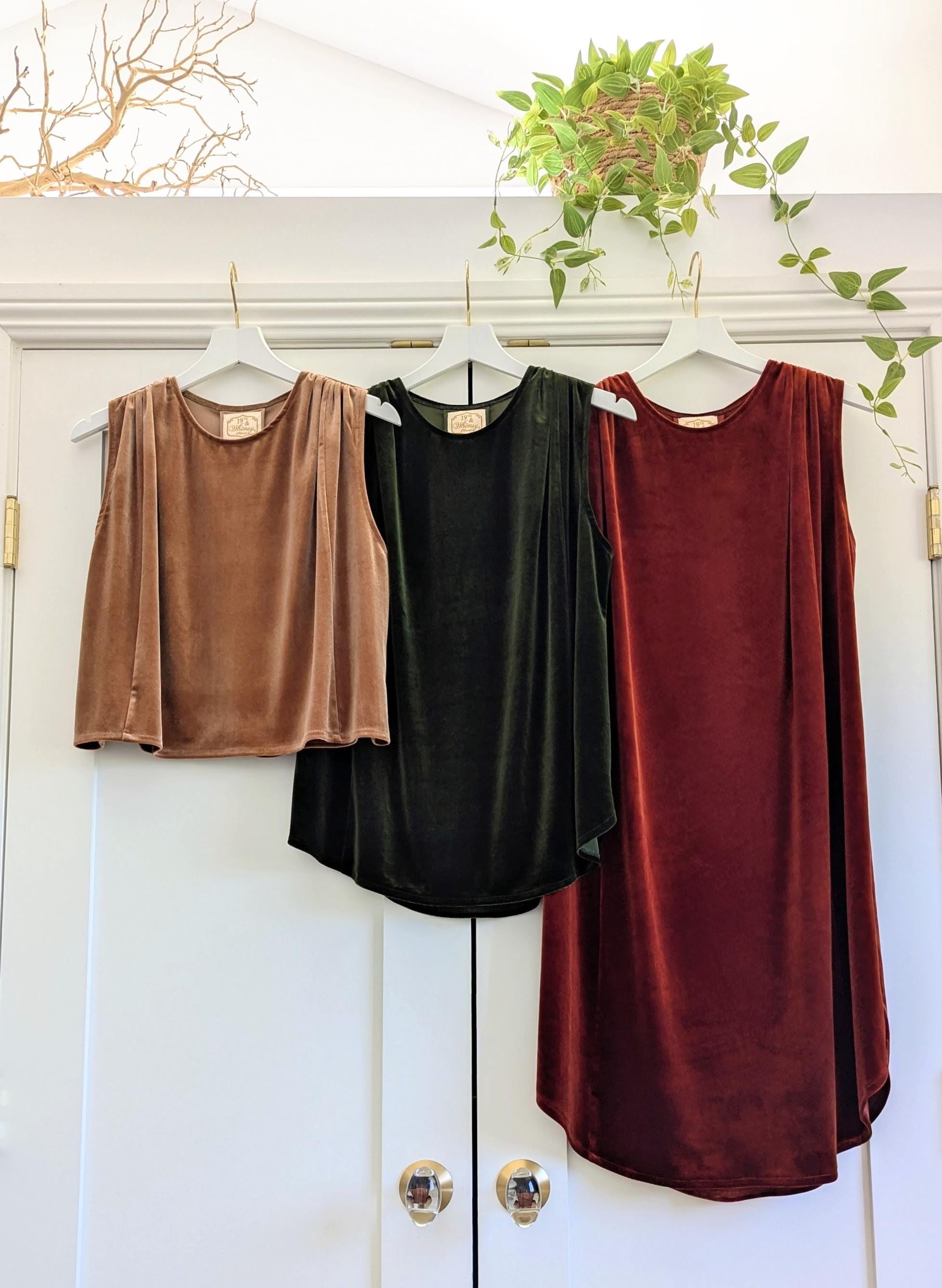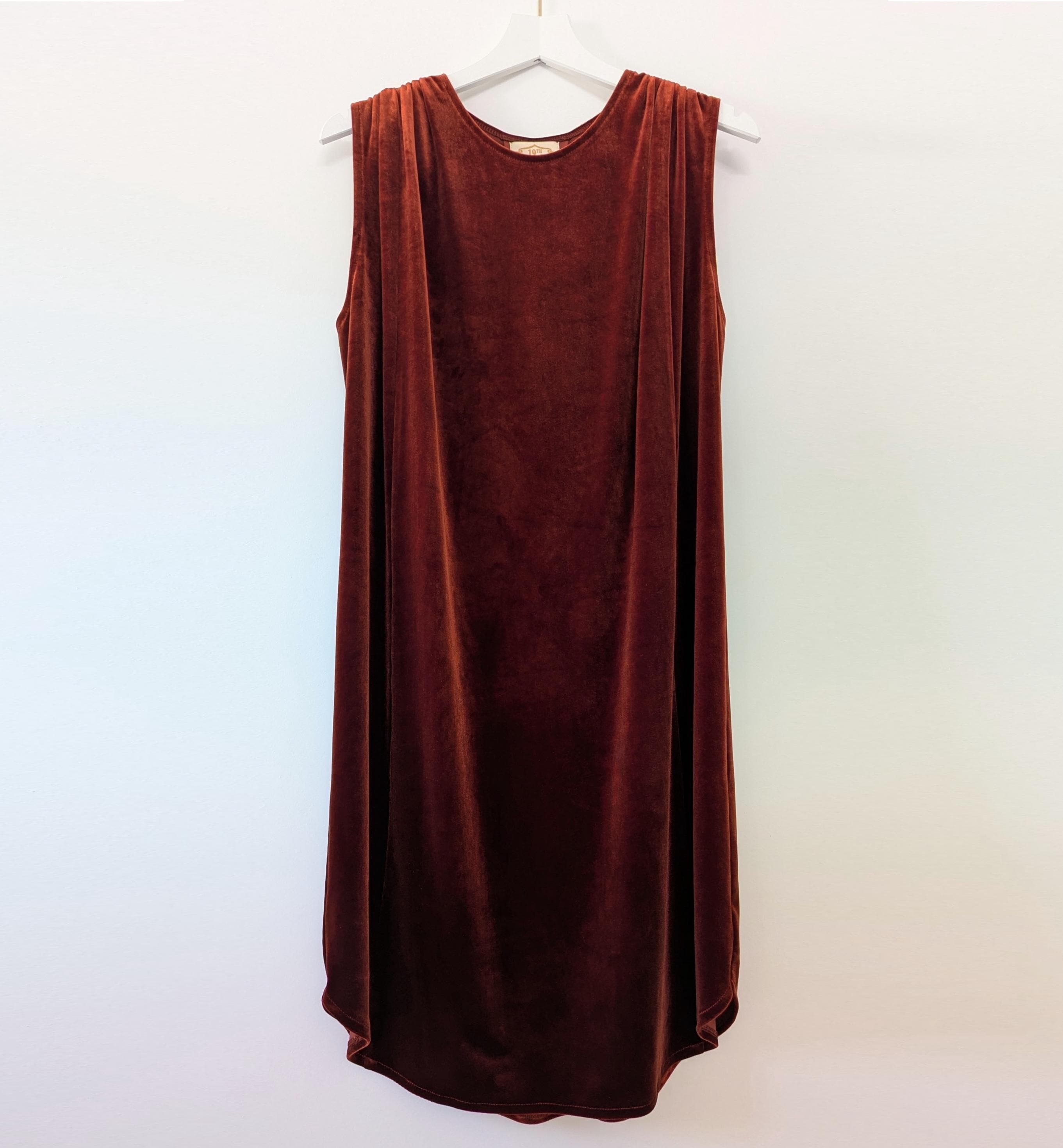 The Velvet Sleeveless Draped Midi Dress features front shoulder shirring, center back pleats, and a shirttail hemline. Pair it with booties and a jacket or cinch it in with your own belt. Please note that the Rust Orange, Toffee, Blue Steel, & Jet Black fabrics are slightly heavier-weight than the Pink Mauve, Plum Purple, & Olive Green. Velvets appear dramatically different depending on lighting. Please request a swatch first for $1 if you're unsure about a color.