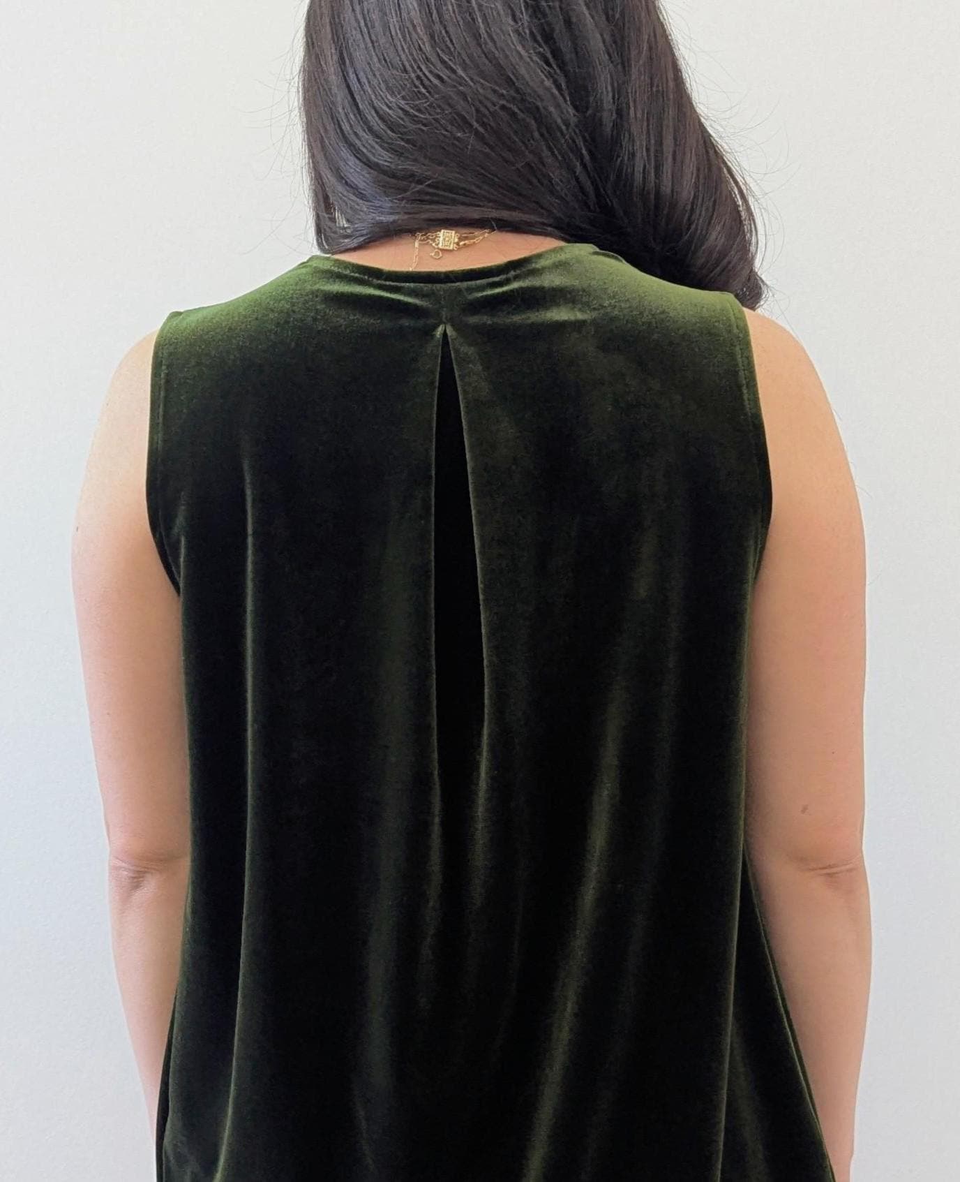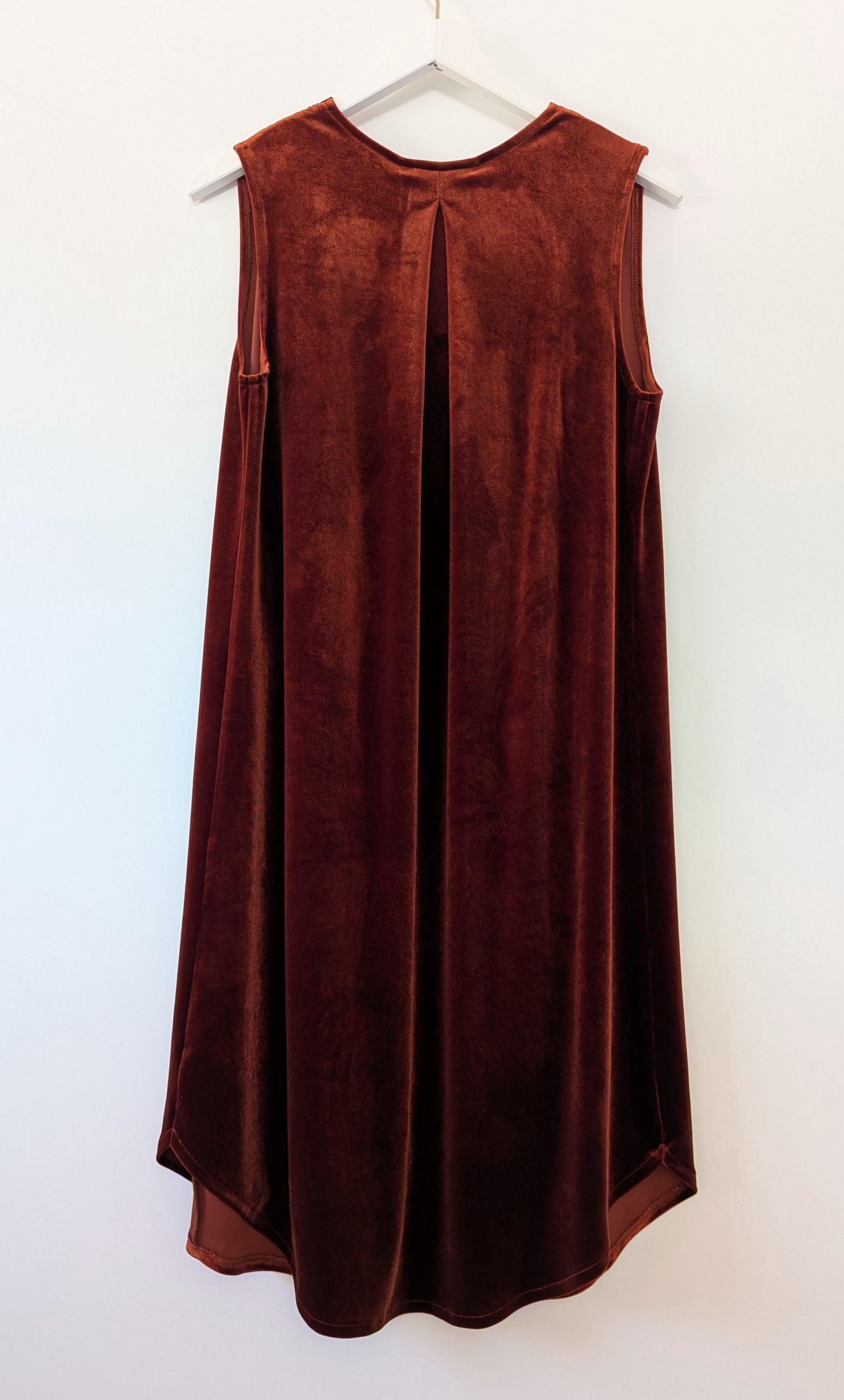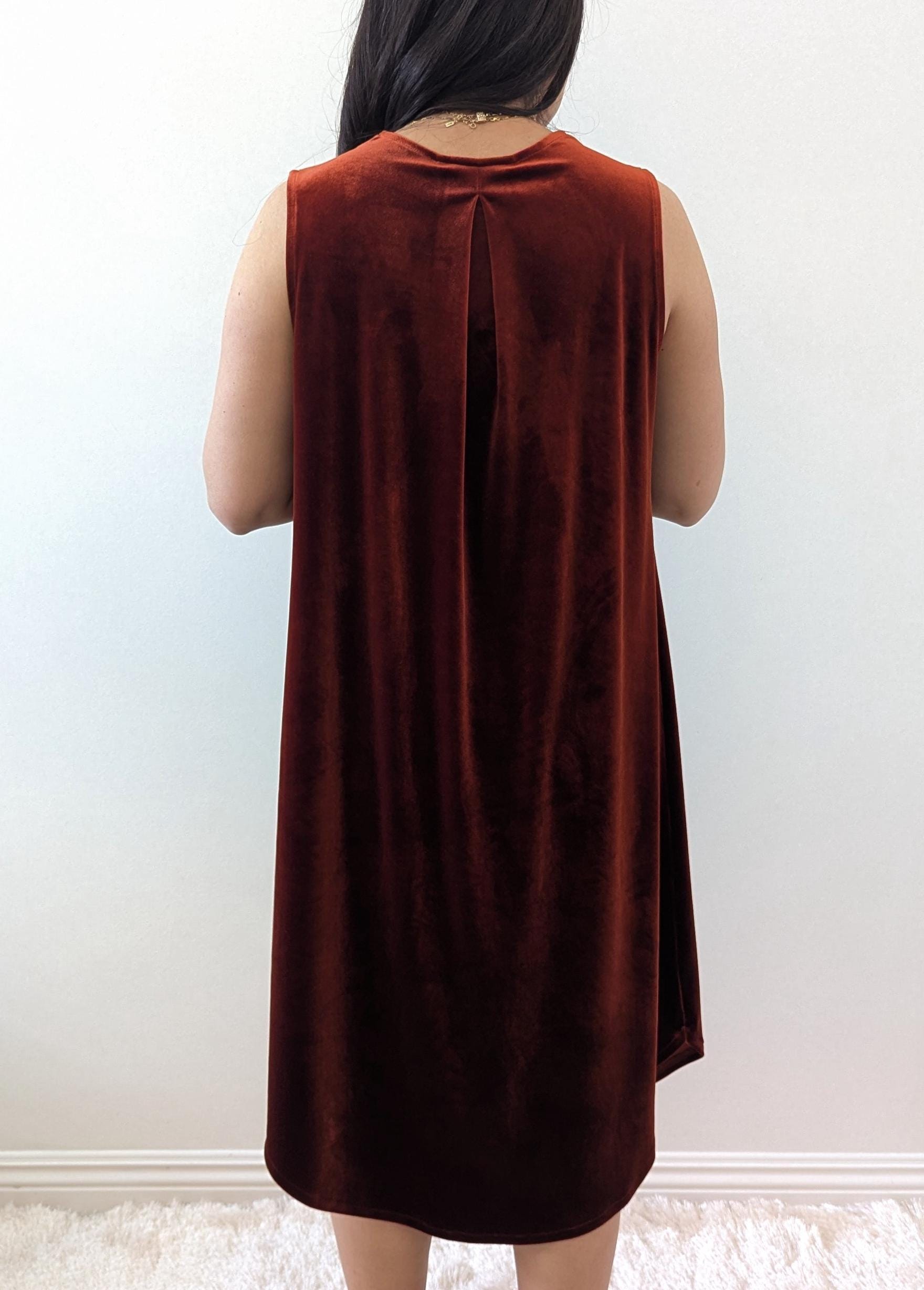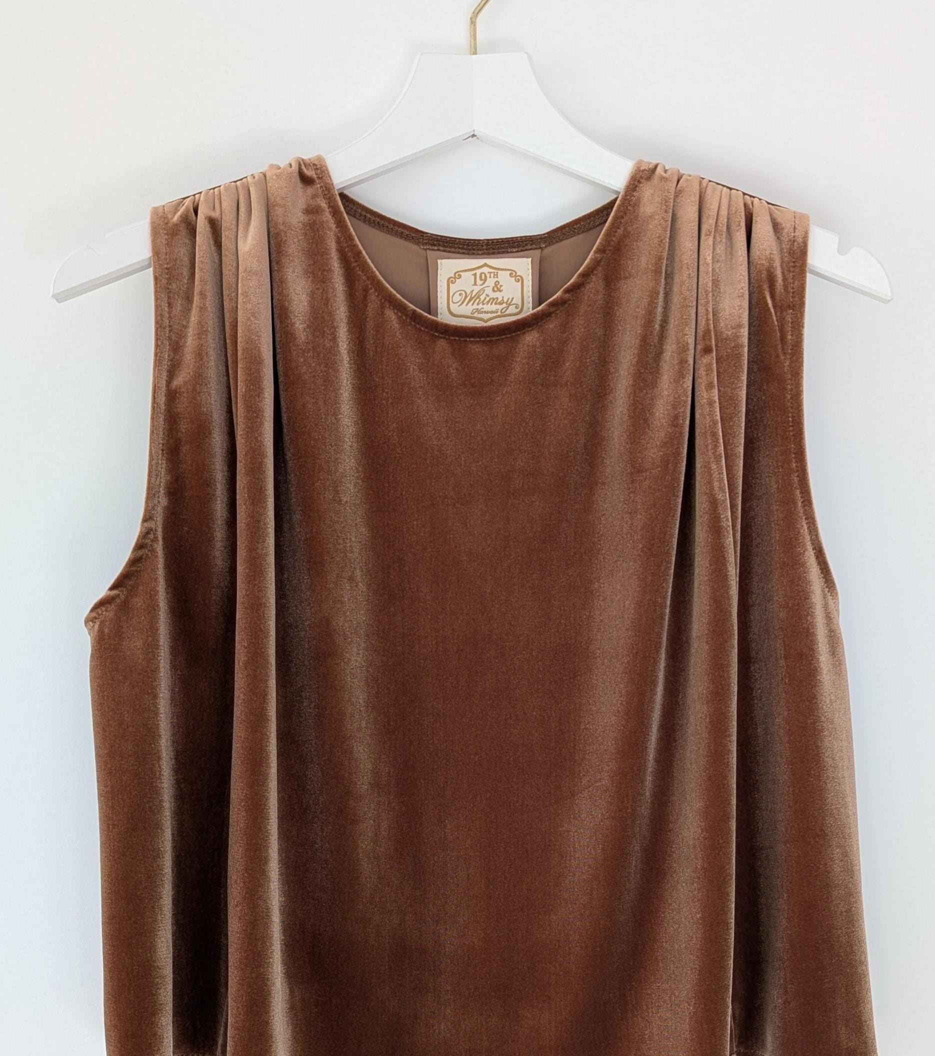 The Velvet Sleeveless Draped Midi Dress features front shoulder shirring, center back pleats, and a shirttail hemline. Pair it with booties and a jacket or cinch it in with your own belt. Please note that the Rust Orange, Toffee, Blue Steel, & Jet Black fabrics are slightly heavier-weight than the Pink Mauve, Plum Purple, & Olive Green. Velvets appear dramatically different depending on lighting. Please request a swatch first for $1 if you're unsure about a color.