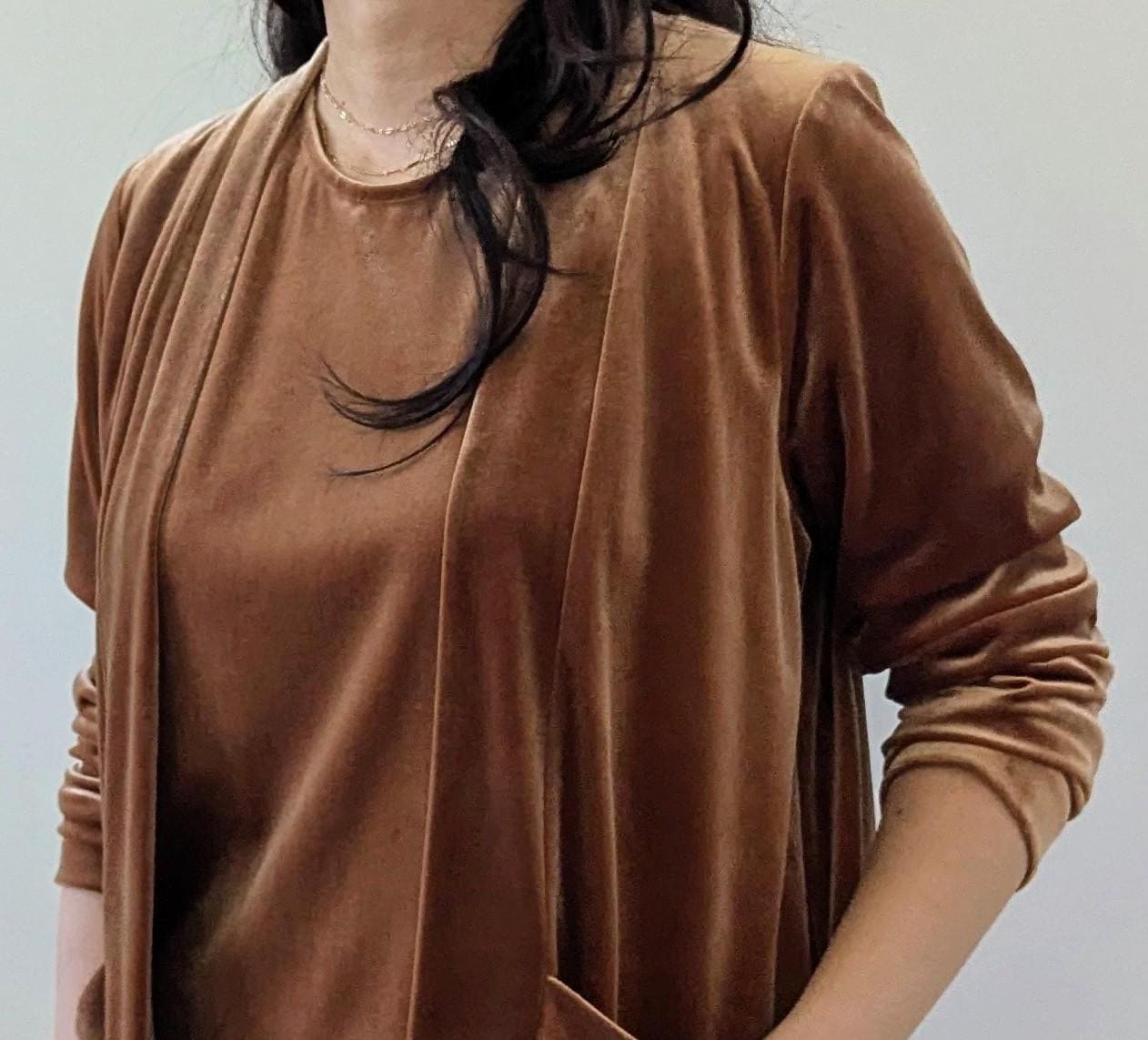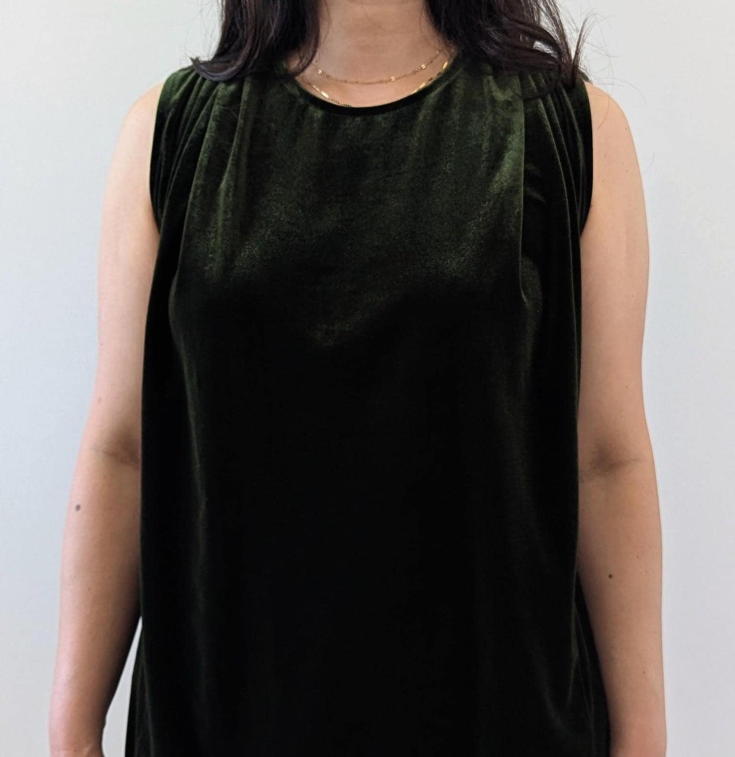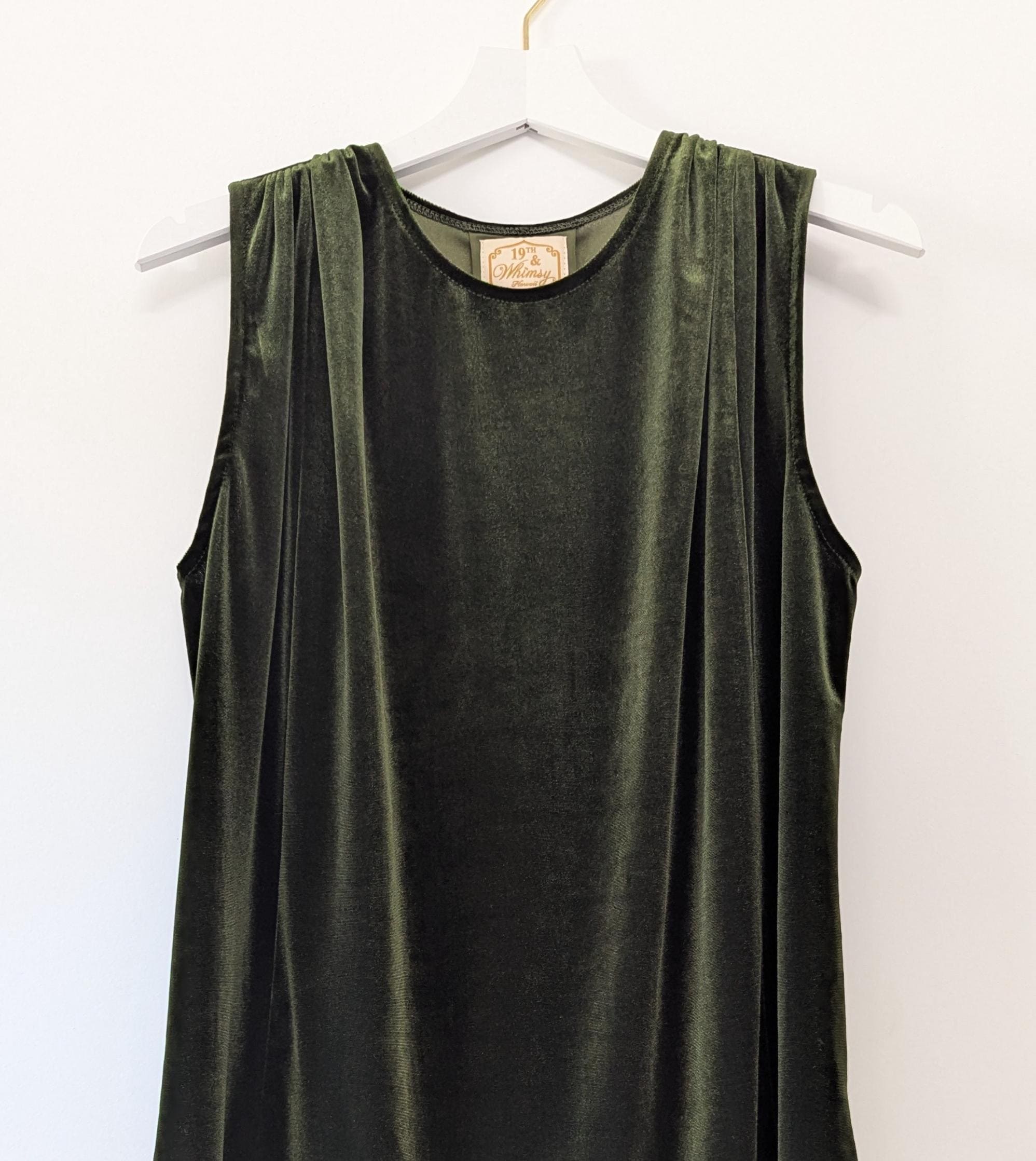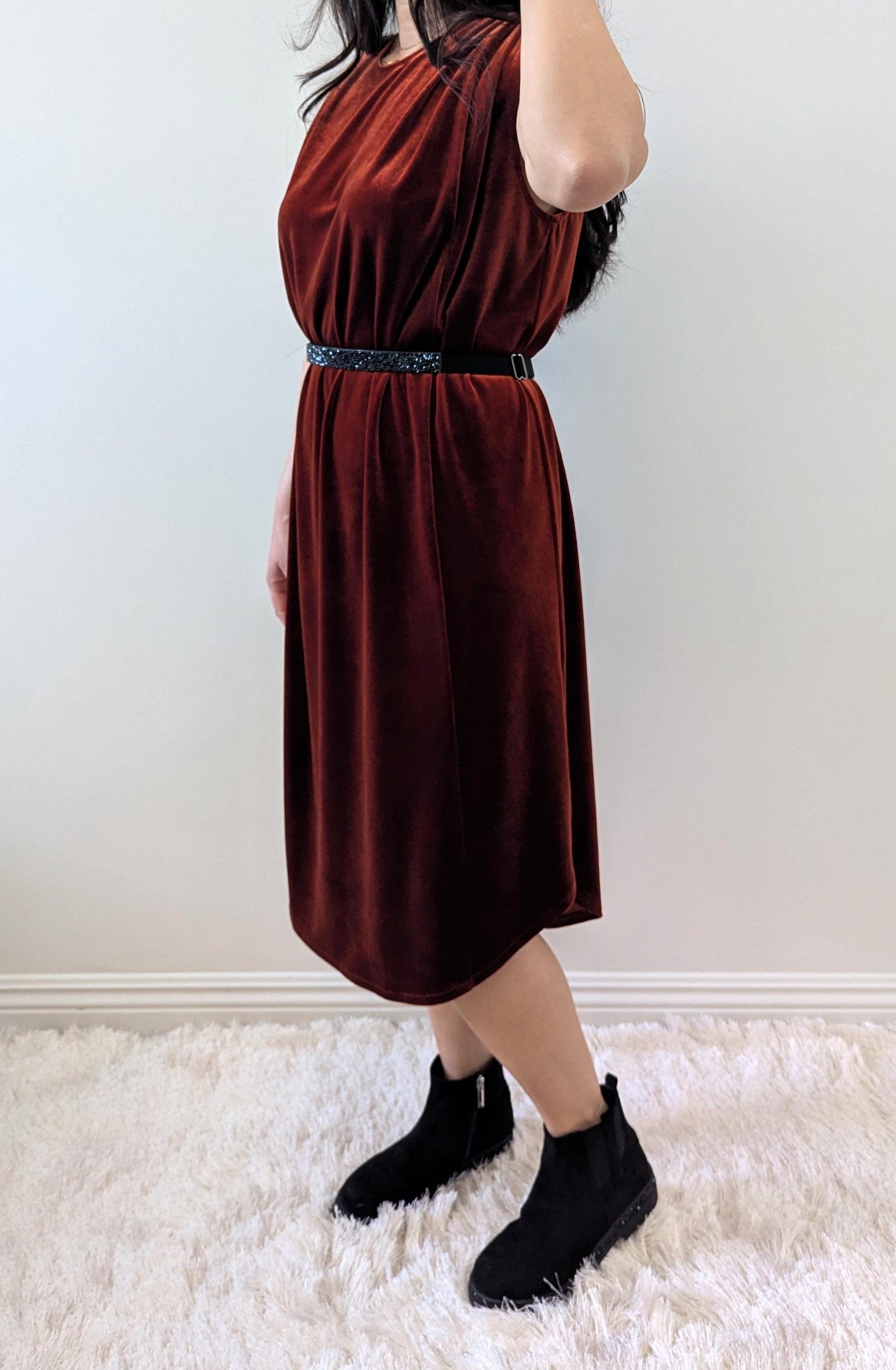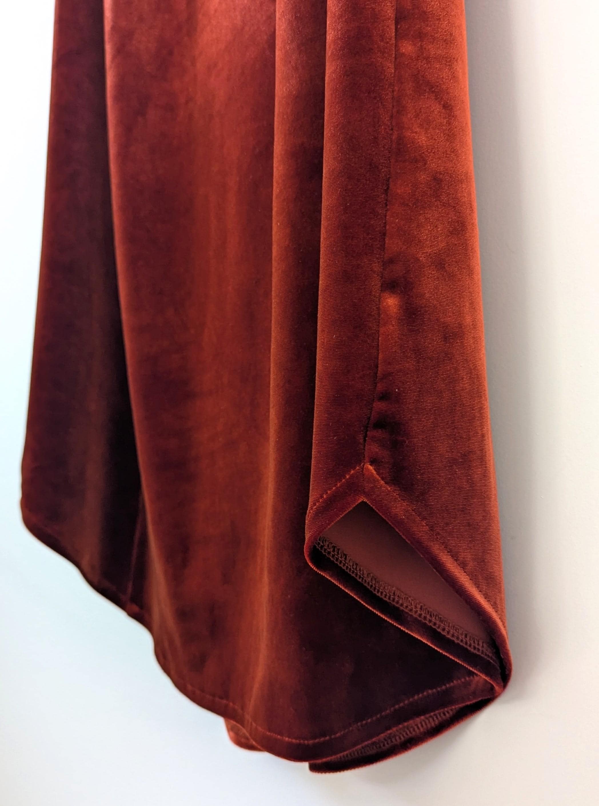 The Velvet Sleeveless Draped Midi Dress features front shoulder shirring, center back pleats, and a shirttail hemline. Pair it with booties and a jacket or cinch it in with your own belt. Please note that the Rust Orange, Toffee, Blue Steel, & Jet Black fabrics are slightly heavier-weight than the Pink Mauve, Plum Purple, & Olive Green. Velvets appear dramatically different depending on lighting. Please request a swatch first for $1 if you're unsure about a color.