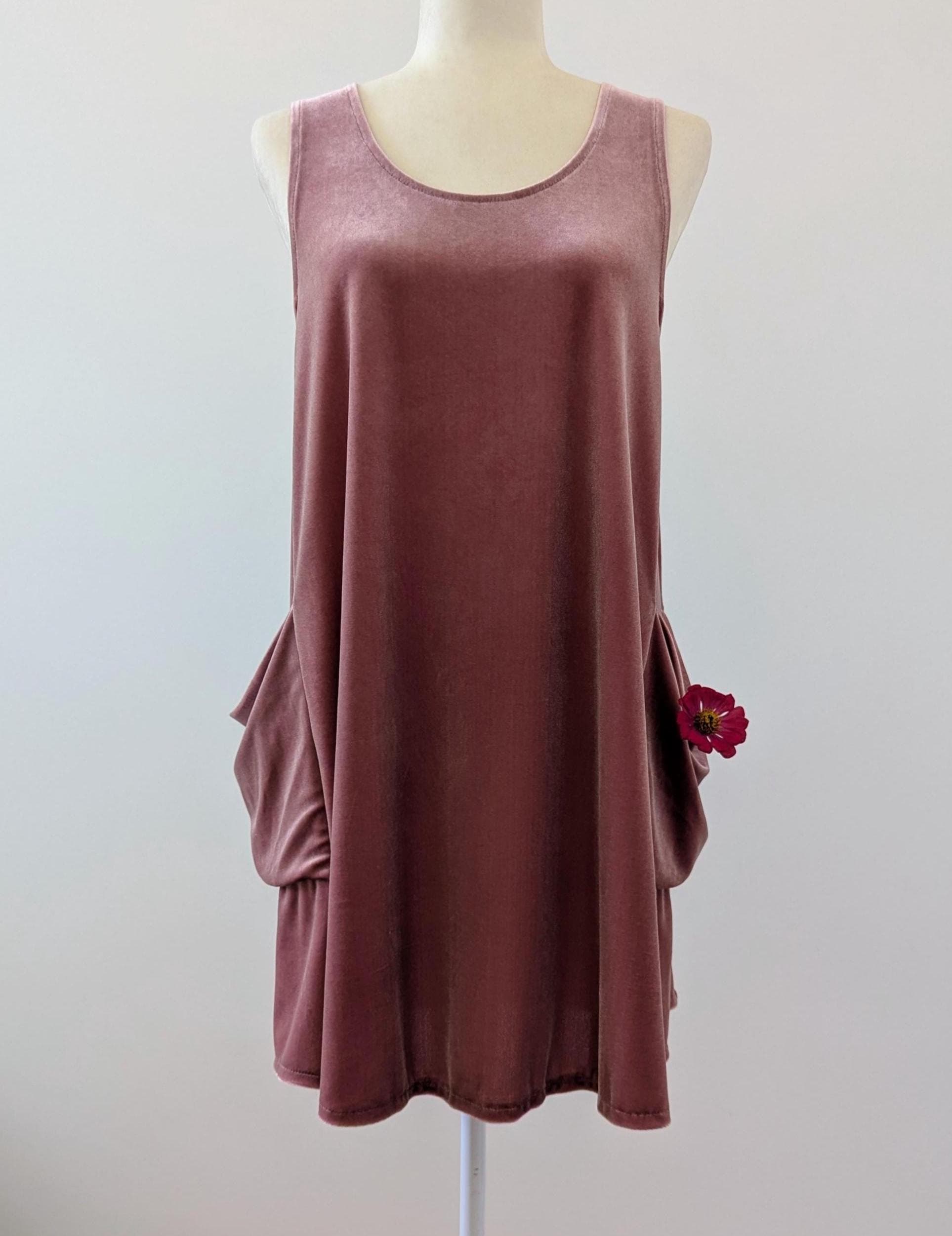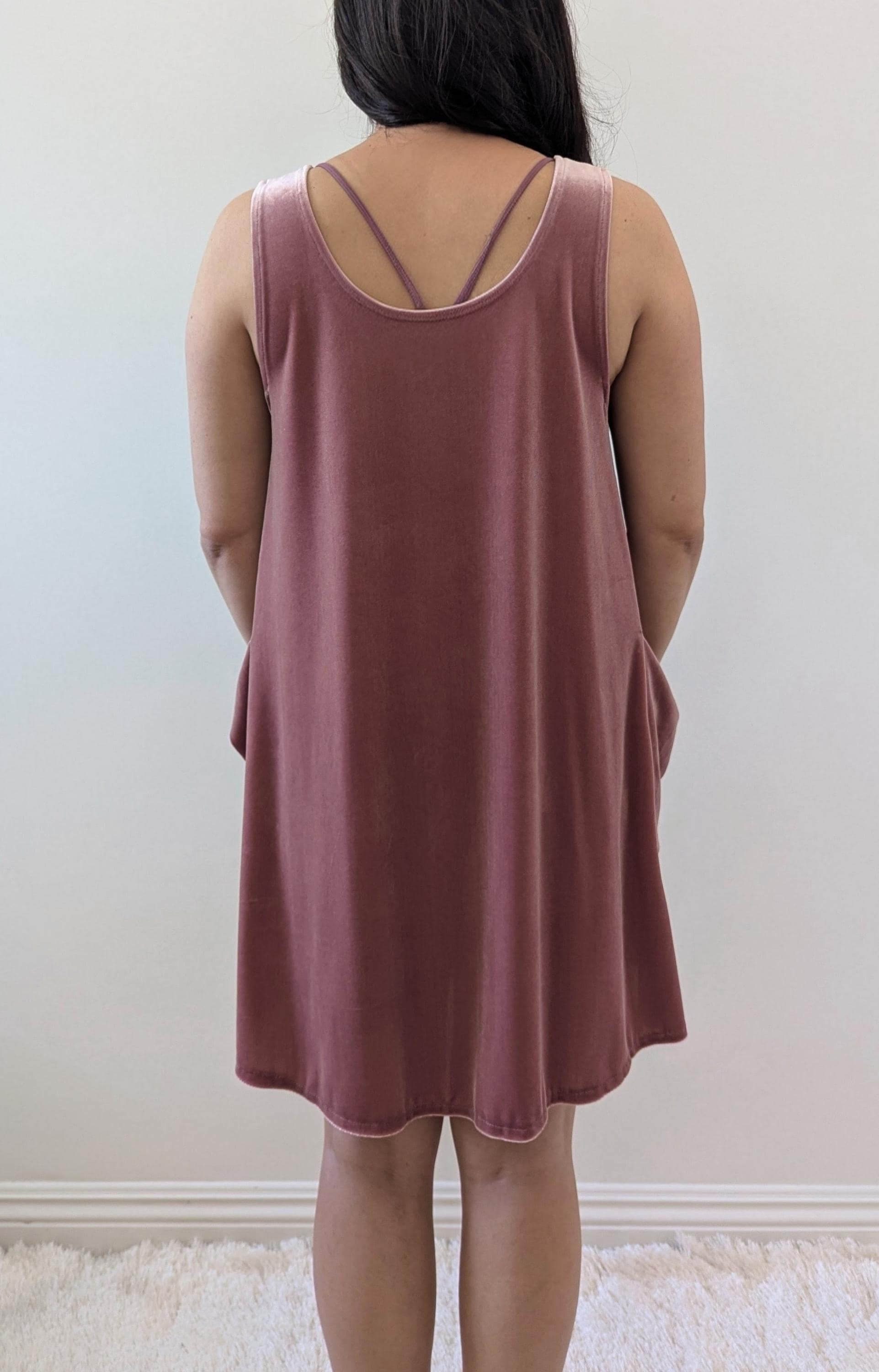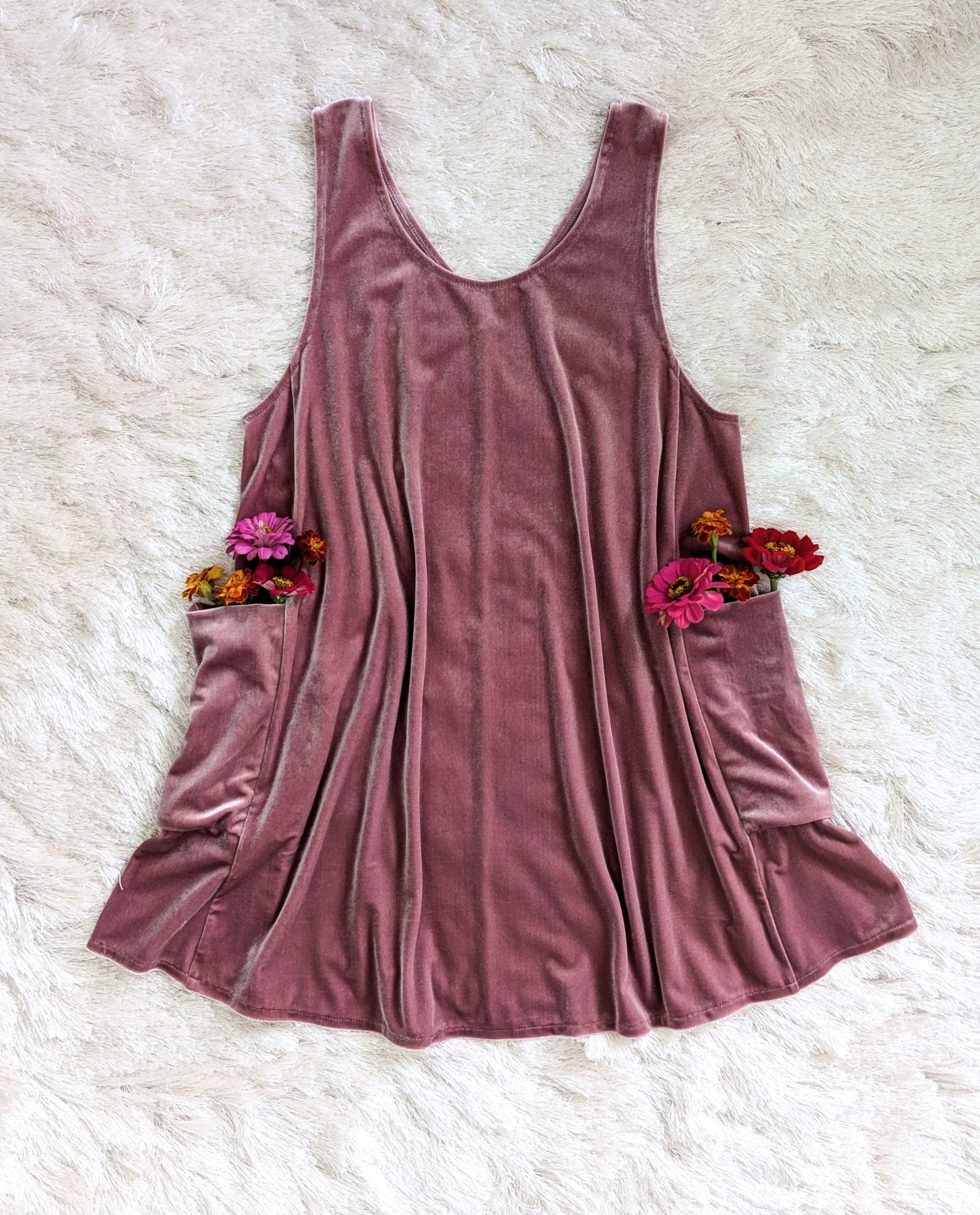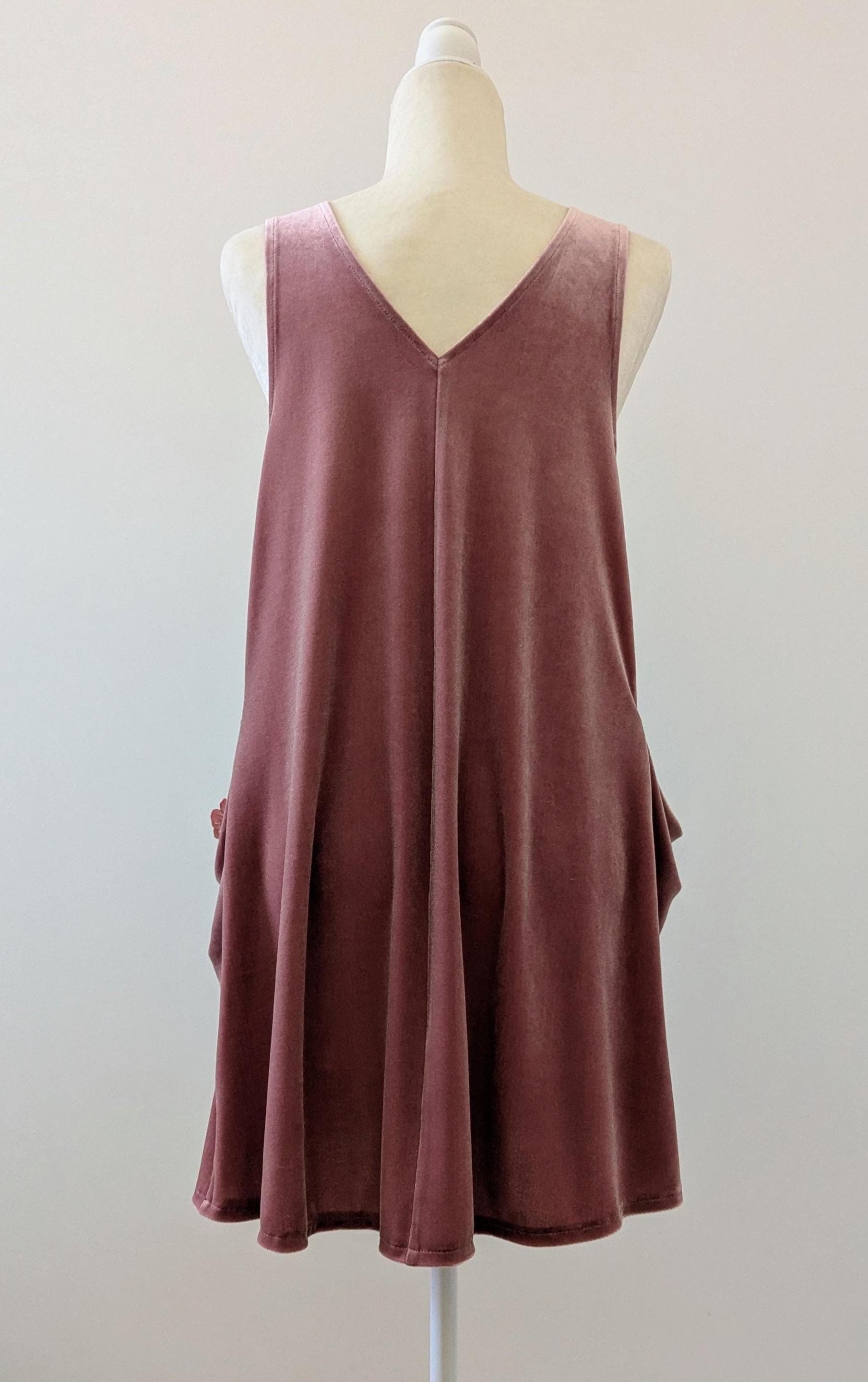 The Velvet Pixie Pocket Mini Dress is a fun and versatile style that features reversible v-neck and scoop necklines and slouchy pockets. Pair with a bralette or wear over a tee or blouse for a jumper look. Please note that the Rust Orange, Toffee, Blue Steel, & Jet Black fabrics are slightly heavier-weight than the Pink Mauve, Plum Purple, & Olive Green. Velvets appear dramatically different depending on lighting. Please request a swatch for $1 if you're unsure about a color.