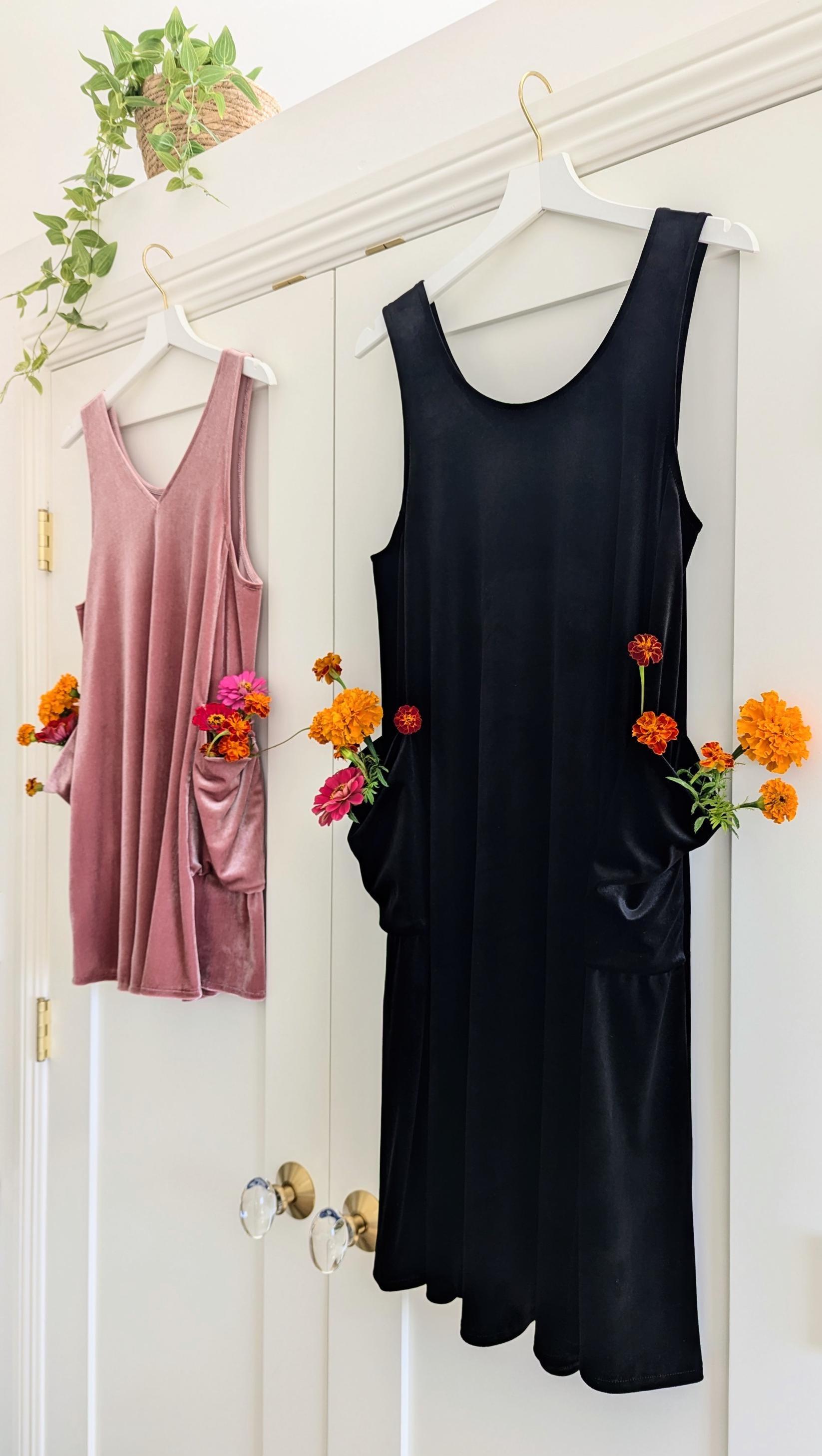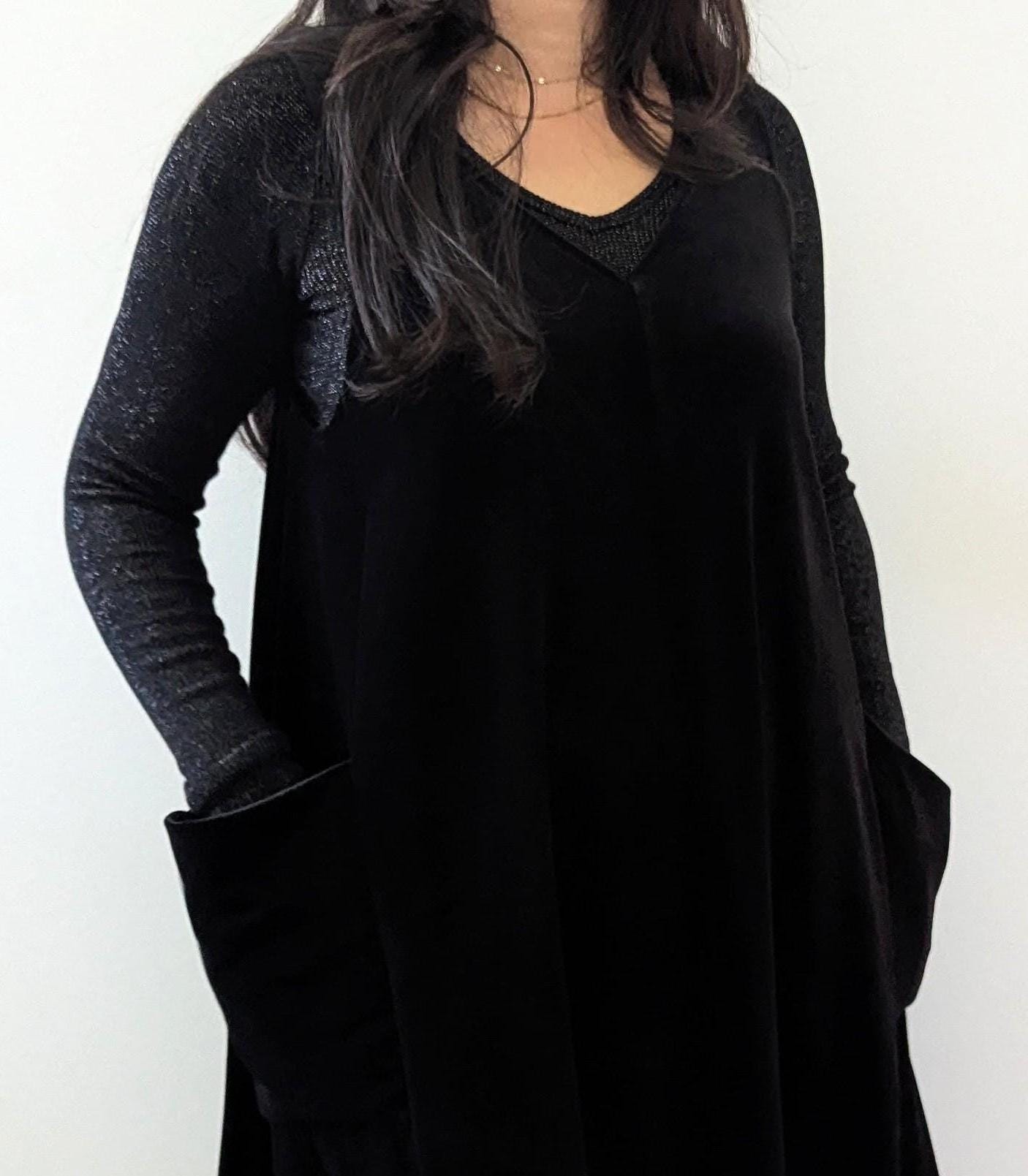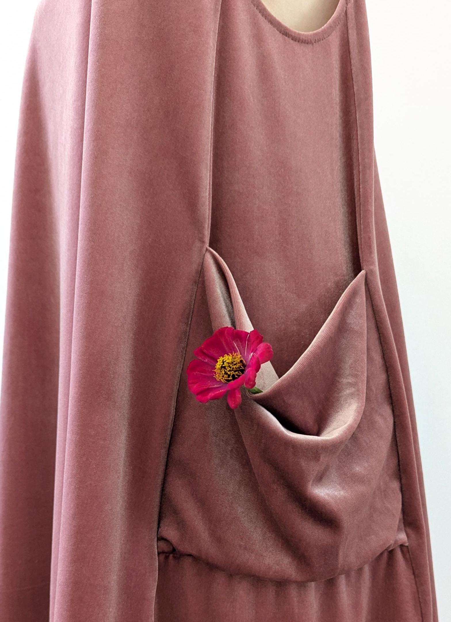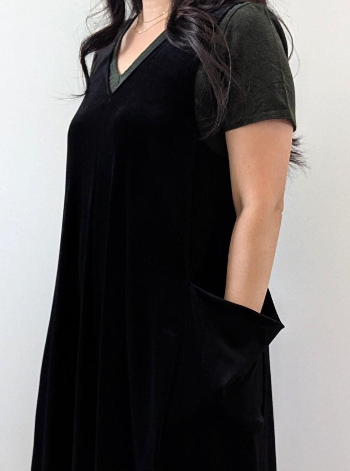 The Velvet Pixie Pocket Mini Dress is a fun and versatile style that features reversible v-neck and scoop necklines and slouchy pockets. Pair with a bralette or wear over a tee or blouse for a jumper look. Please note that the Rust Orange, Toffee, Blue Steel, & Jet Black fabrics are slightly heavier-weight than the Pink Mauve, Plum Purple, & Olive Green. Velvets appear dramatically different depending on lighting. Please request a swatch for $1 if you're unsure about a color.