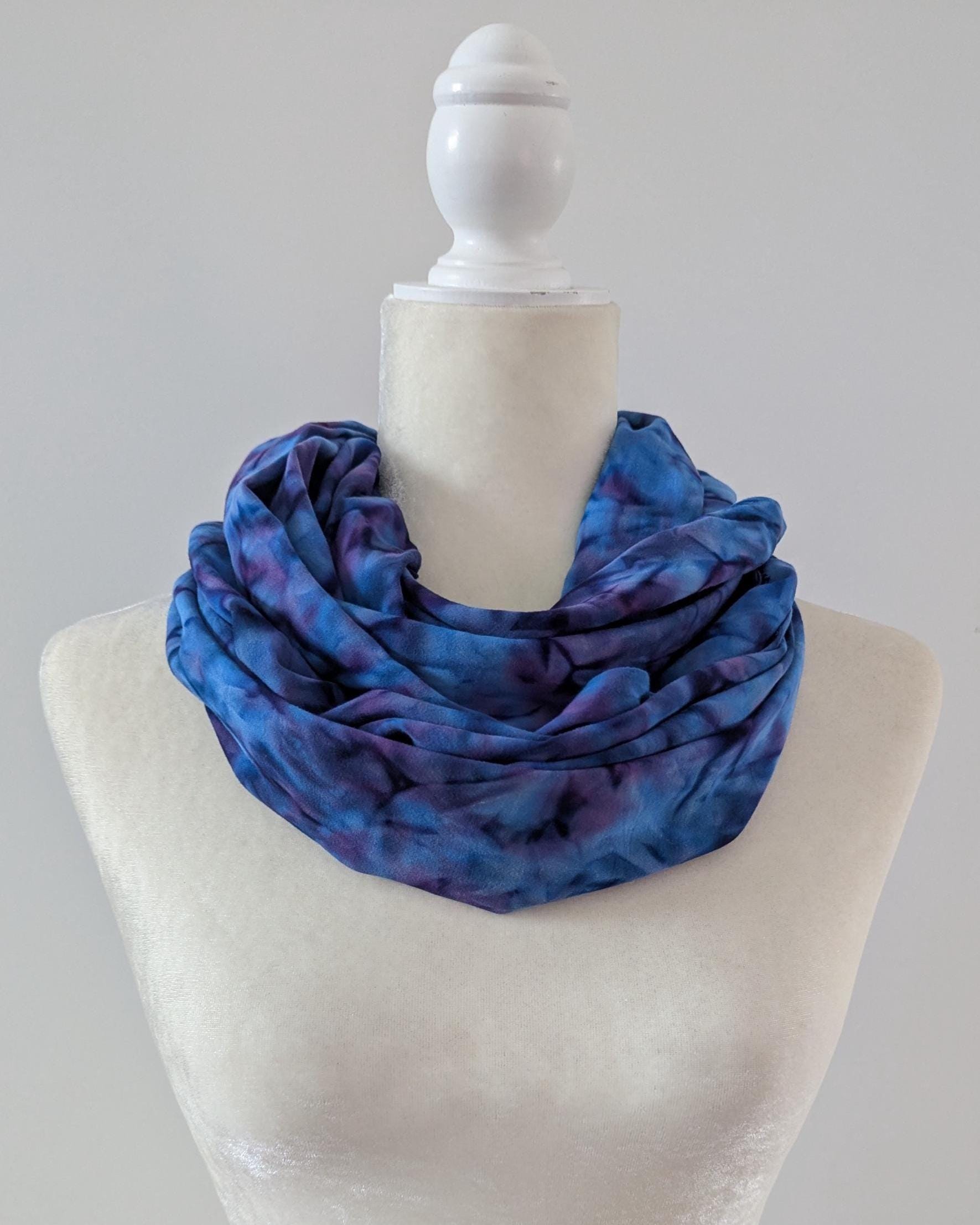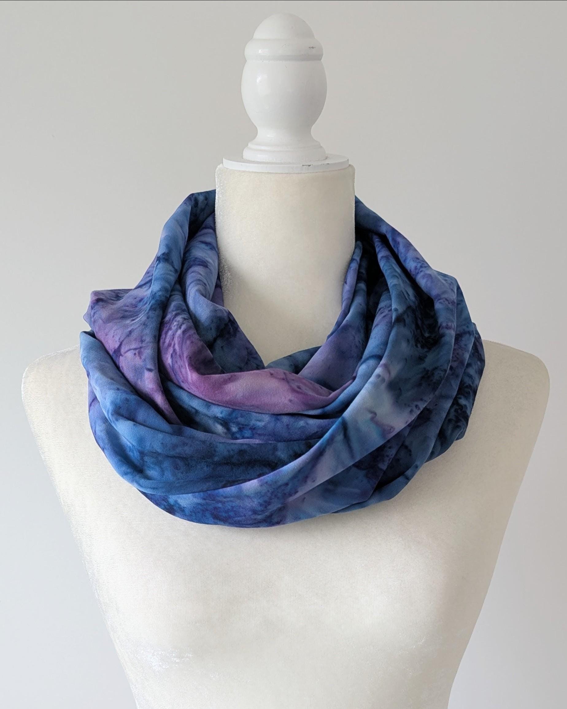 These lightweight woven rayon challis fabrics are beautifully hand dyed by artisans in Indonesia. Color variations in these fabrics should be expected and make each piece one of a kind. Wear it long or doubled - just put it on and fluff! My infinity scarf designs have one full twist to enhance the look and drape of the fabric. Approximate measurements: 11" width x 54" circumference.