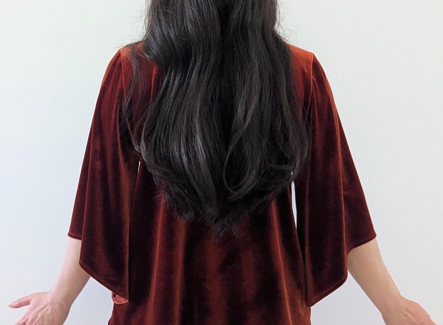 The Velvet Flutter Dress is my new favorite little dressy dress. Keep it simple with booties or flats or dress it up with a belt and jewelry. Please note that the Rust Orange, Toffee, Blue Steel, & Jet Black fabrics are slightly heavier-weight than the Pink Mauve, Plum Purple, & Olive Green. Velvets appear dramatically different depending on lighting. Please request a swatch first for $1 if you're unsure about a color.