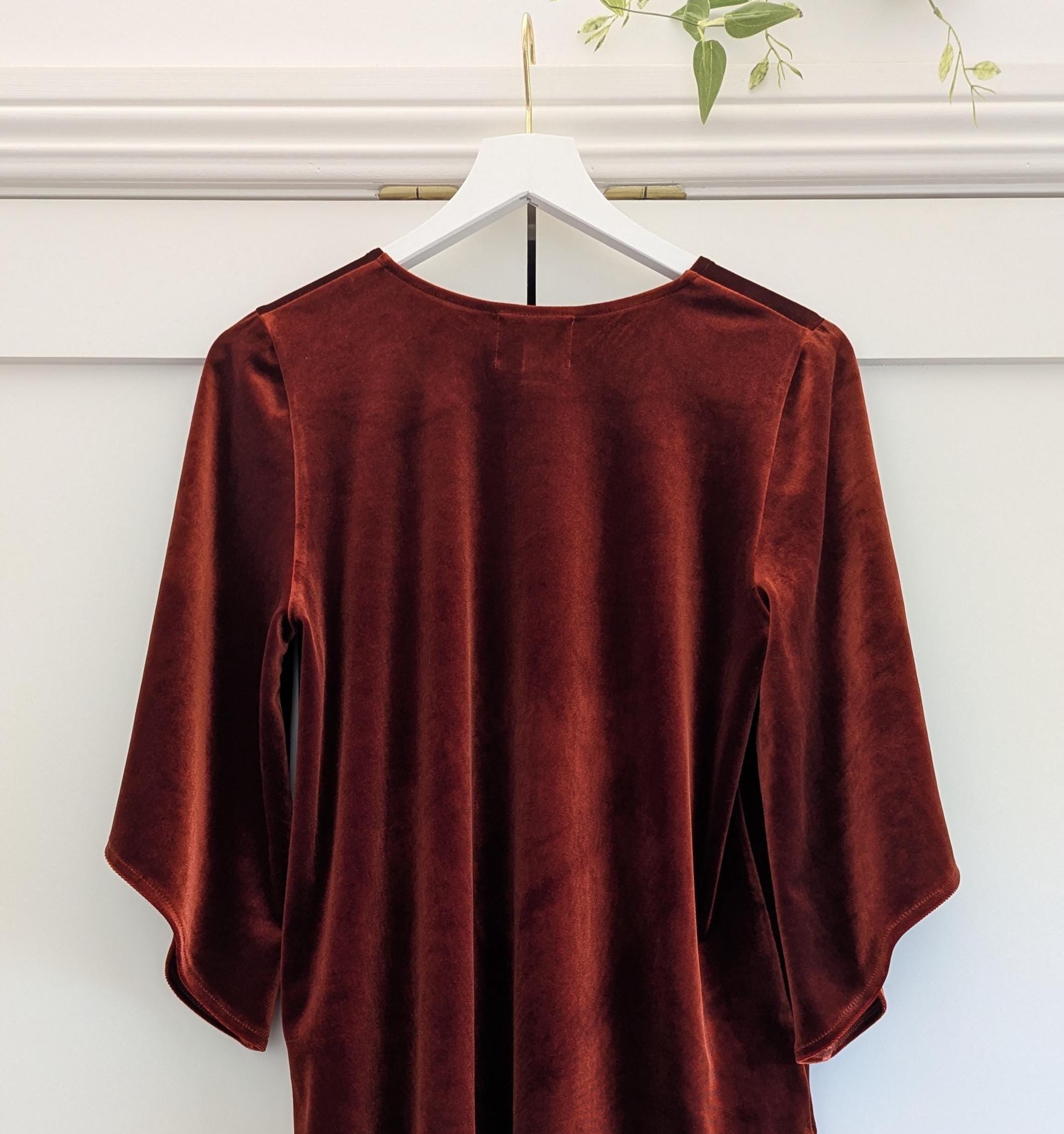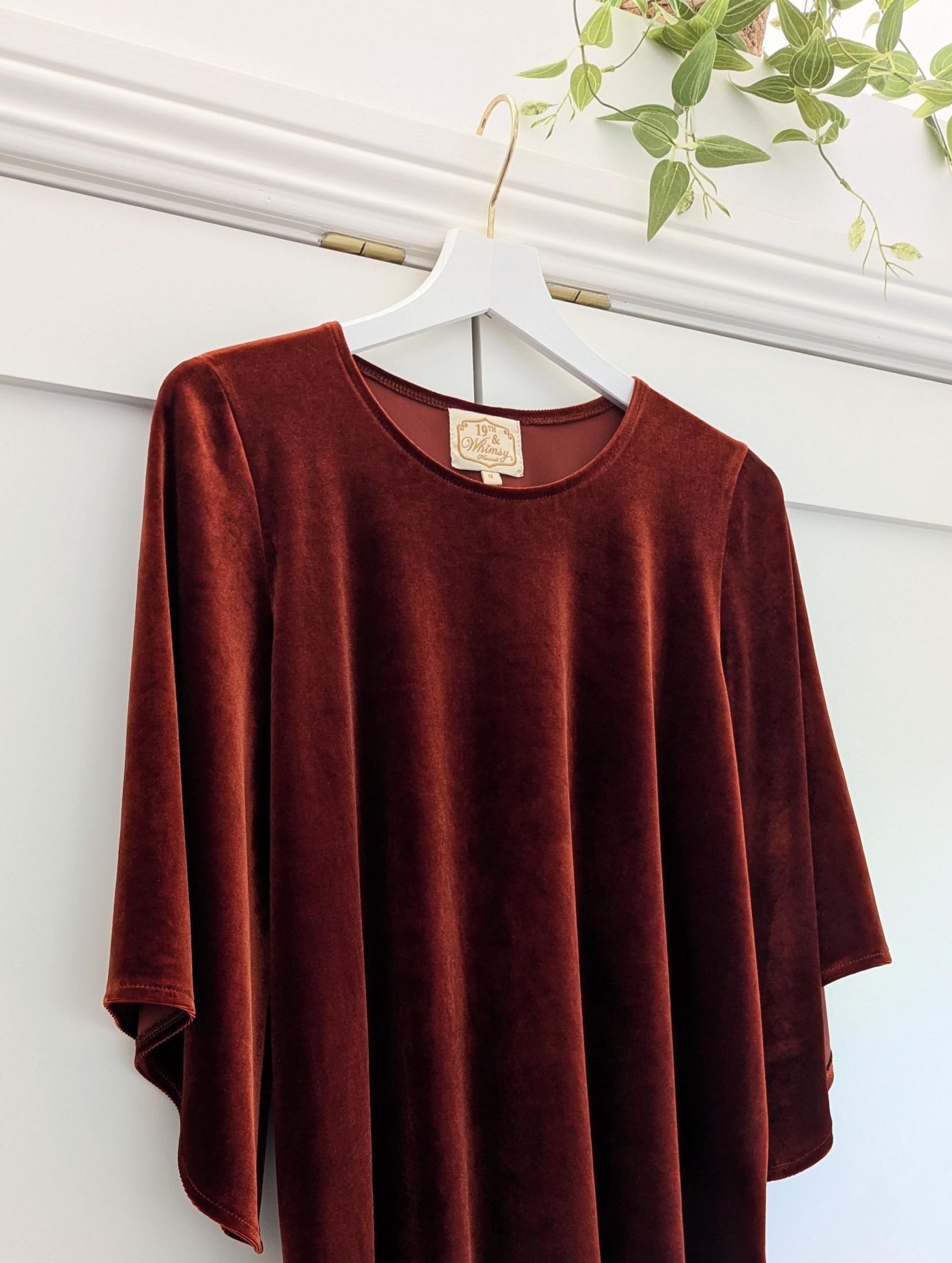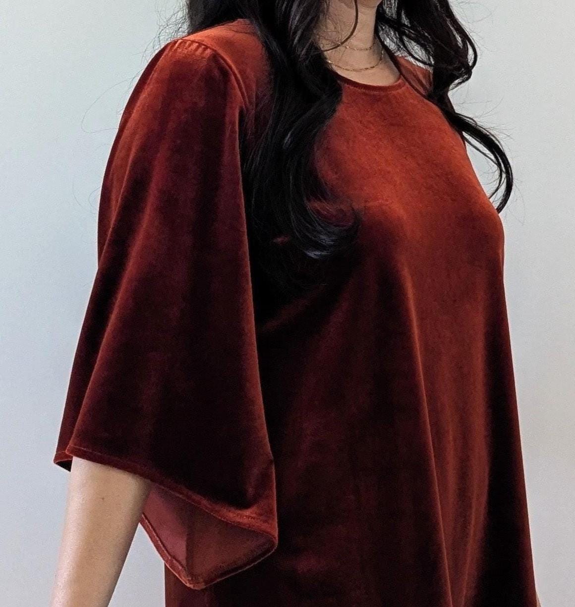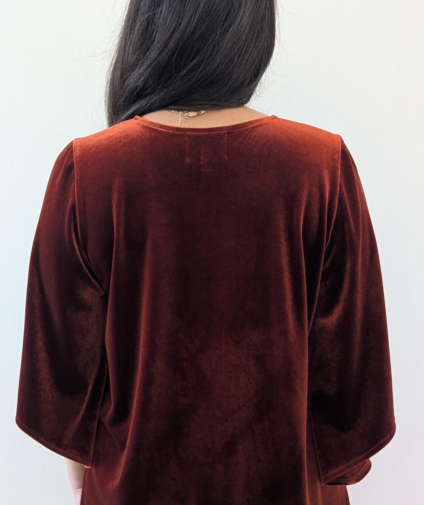 The Velvet Flutter Top adds luxurious shimmer and texture to any look! Pair it with the matching Velvet Culottes or Velvet Midi Skirt for a one-piece look. Please note that the Rust Orange, Toffee, Blue Steel, & Jet Black fabrics are slightly heavier-weight than the Pink Mauve, Plum Purple, & Olive Green. Velvets appear dramatically different depending on lighting. Please request a swatch first for $1 if you're unsure about a color.