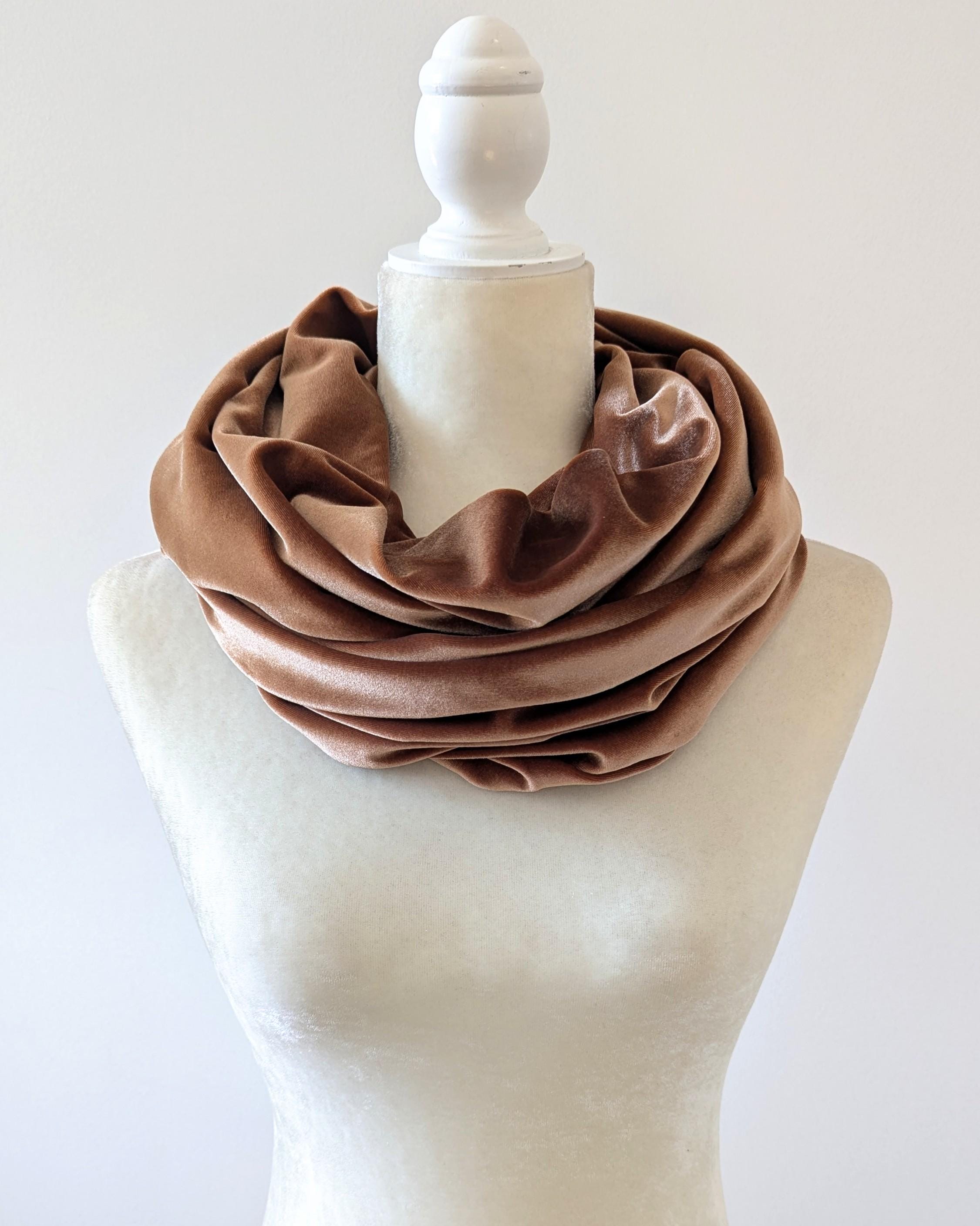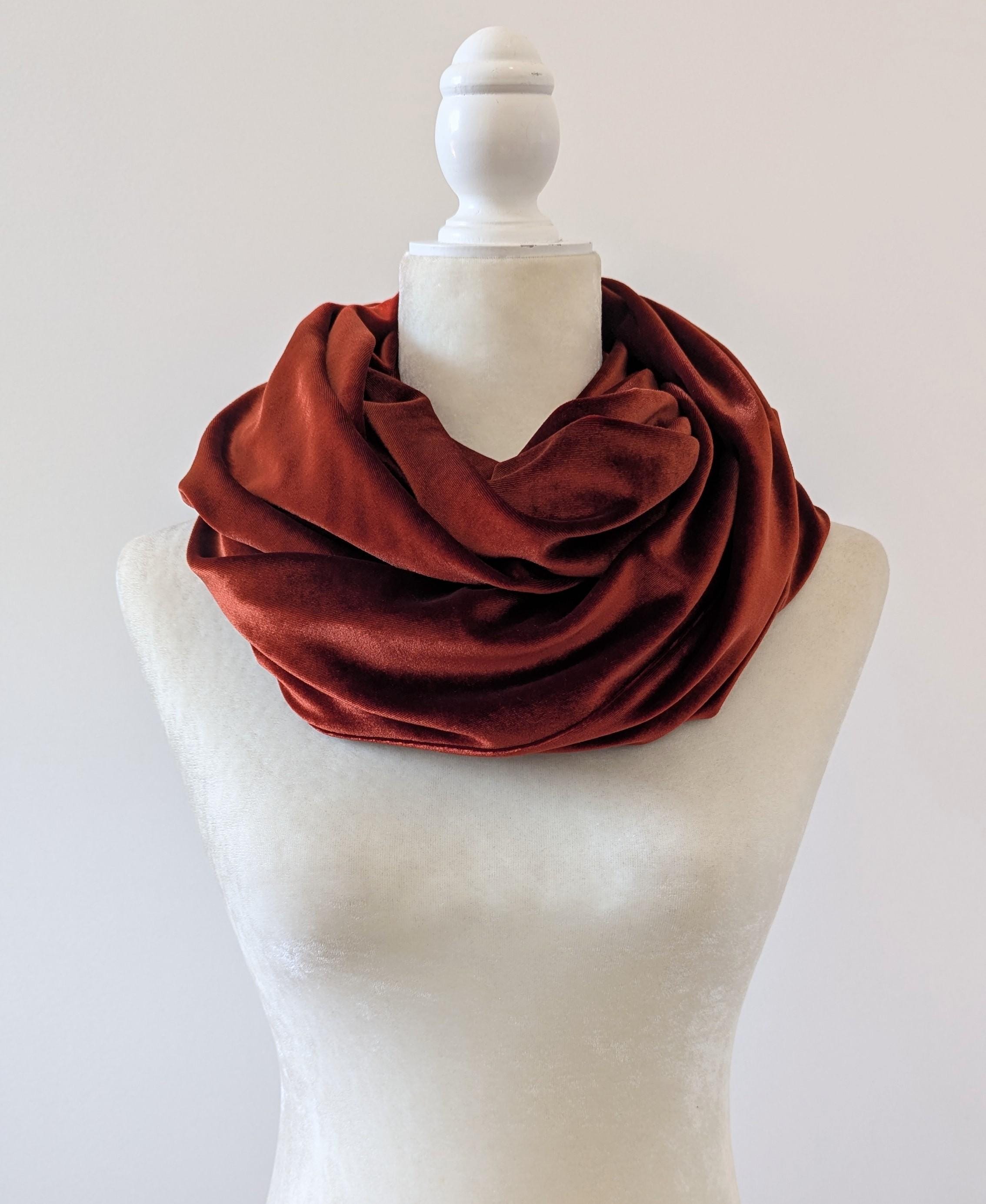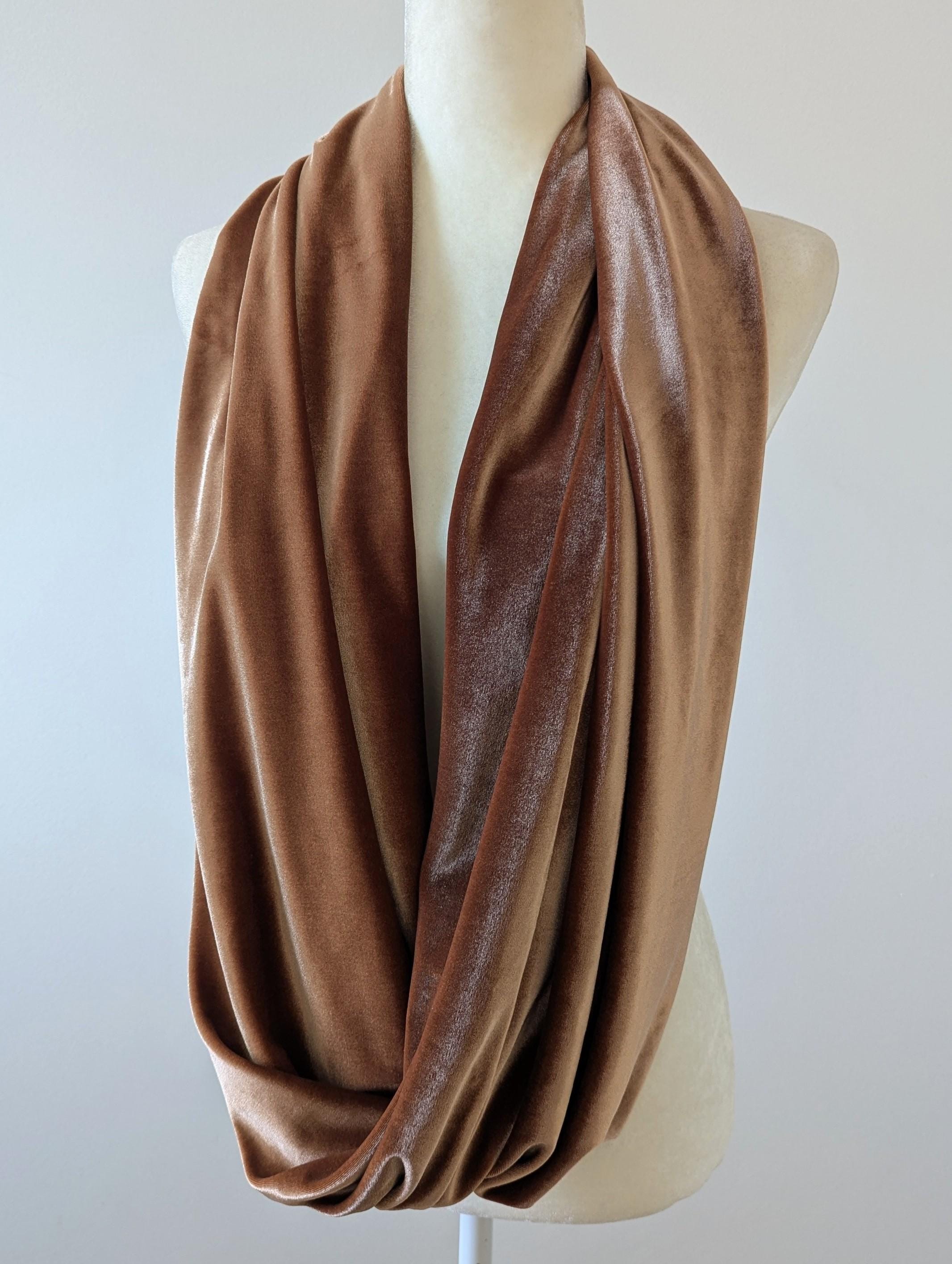 Add some shimmer and shine to your look with the Velvet Infinity Scarf. Wear long or doubled - just put it on and fluff! My infinity scarf designs have one full twist to enhance the look and drape of the fabric. Mediumweight stretch velvet knit fabric has great drape. Approximate measurements: 14" width x 56" circumference. Please note that the Rust Orange, Toffee, Blue Steel, & Jet Black fabrics are slightly heavier-weight than the Pink Mauve, Plum Purple, & Olive Green. Velvets appear dramatically different depending on lighting. Please request a swatch first for $1 if you're unsure about a color.